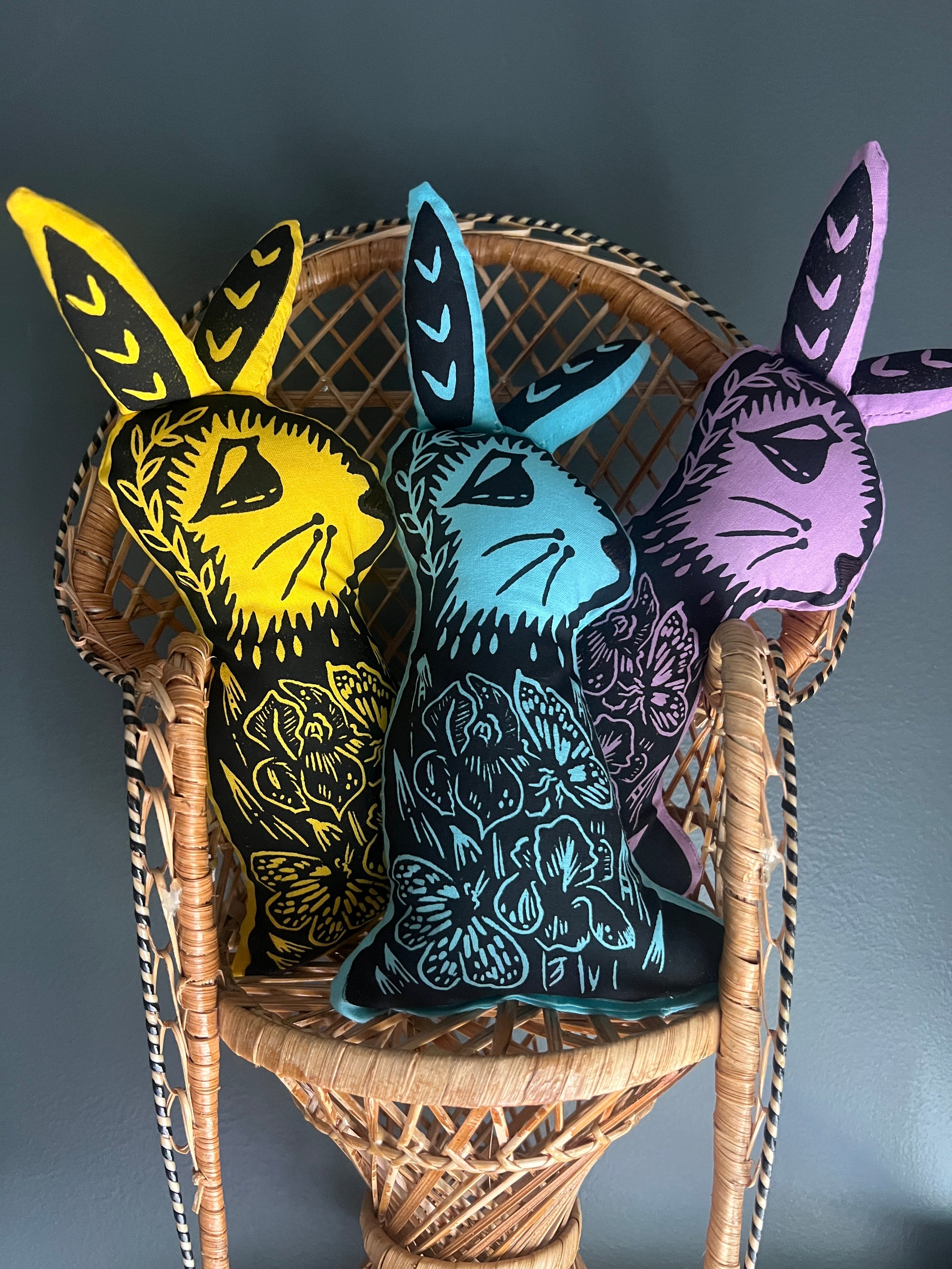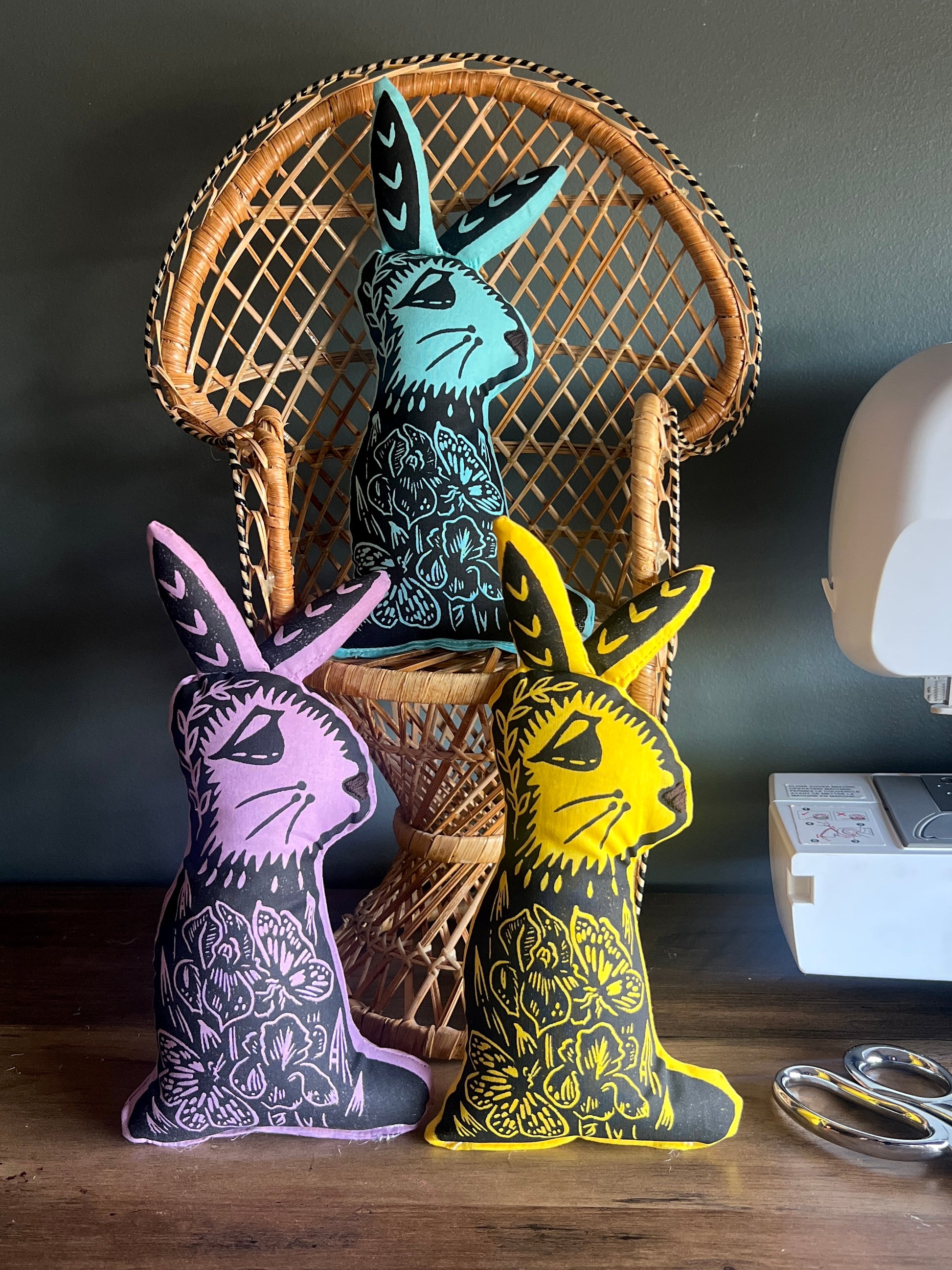 My original handmade creations, these approximately 9”x 4” plush bunnies are created with the traditional art of block printing. This began as a gift for my daughter who loves bunnies. I carved out a silhouette and doodled some florals and a mopey, little face directly onto the block. Each bunny is hand printed and then given a little embroidered nose.