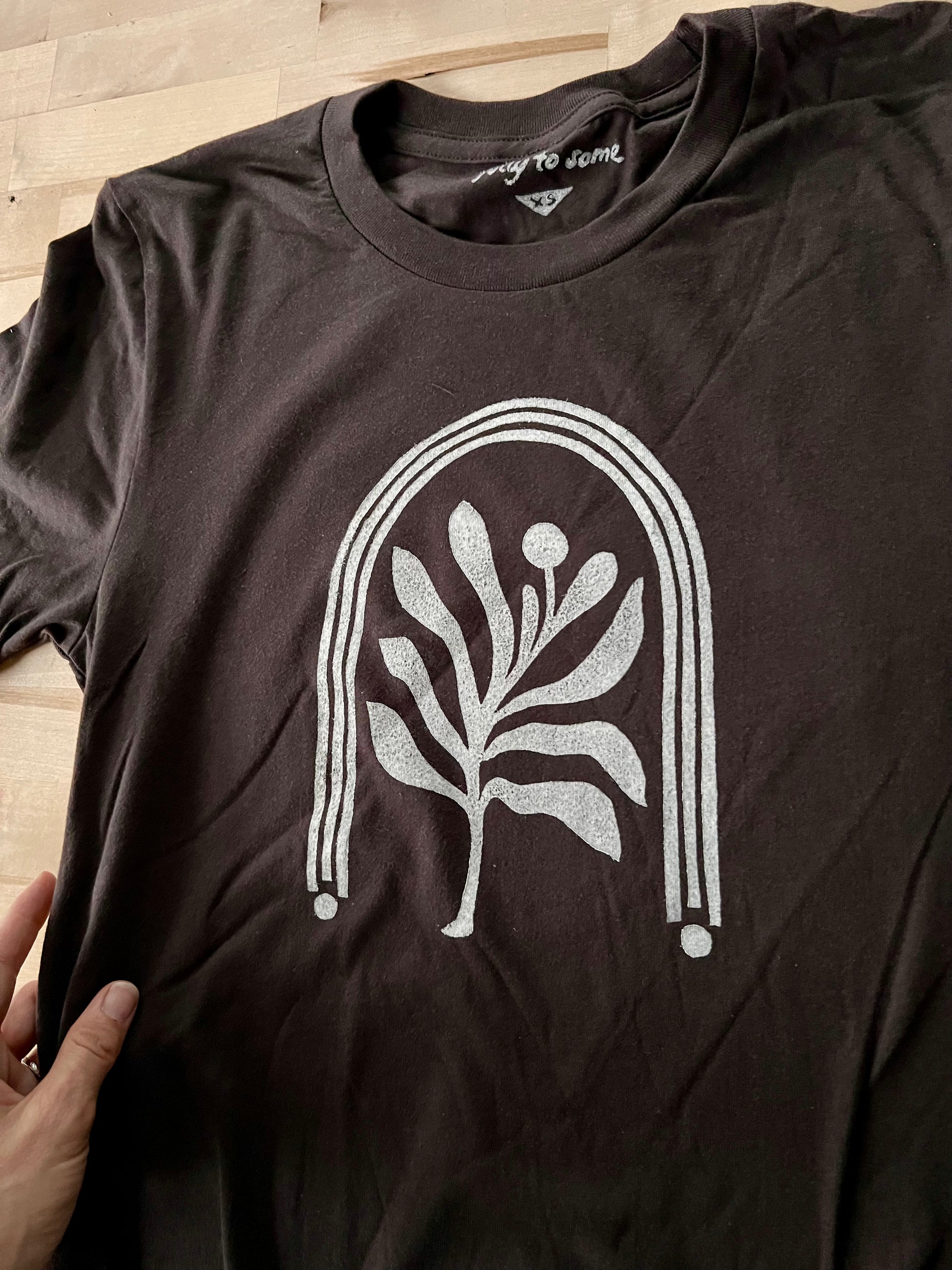 A botanical and geometric motif in white ink on a dark brown tee, 100% cotton and unisex size.