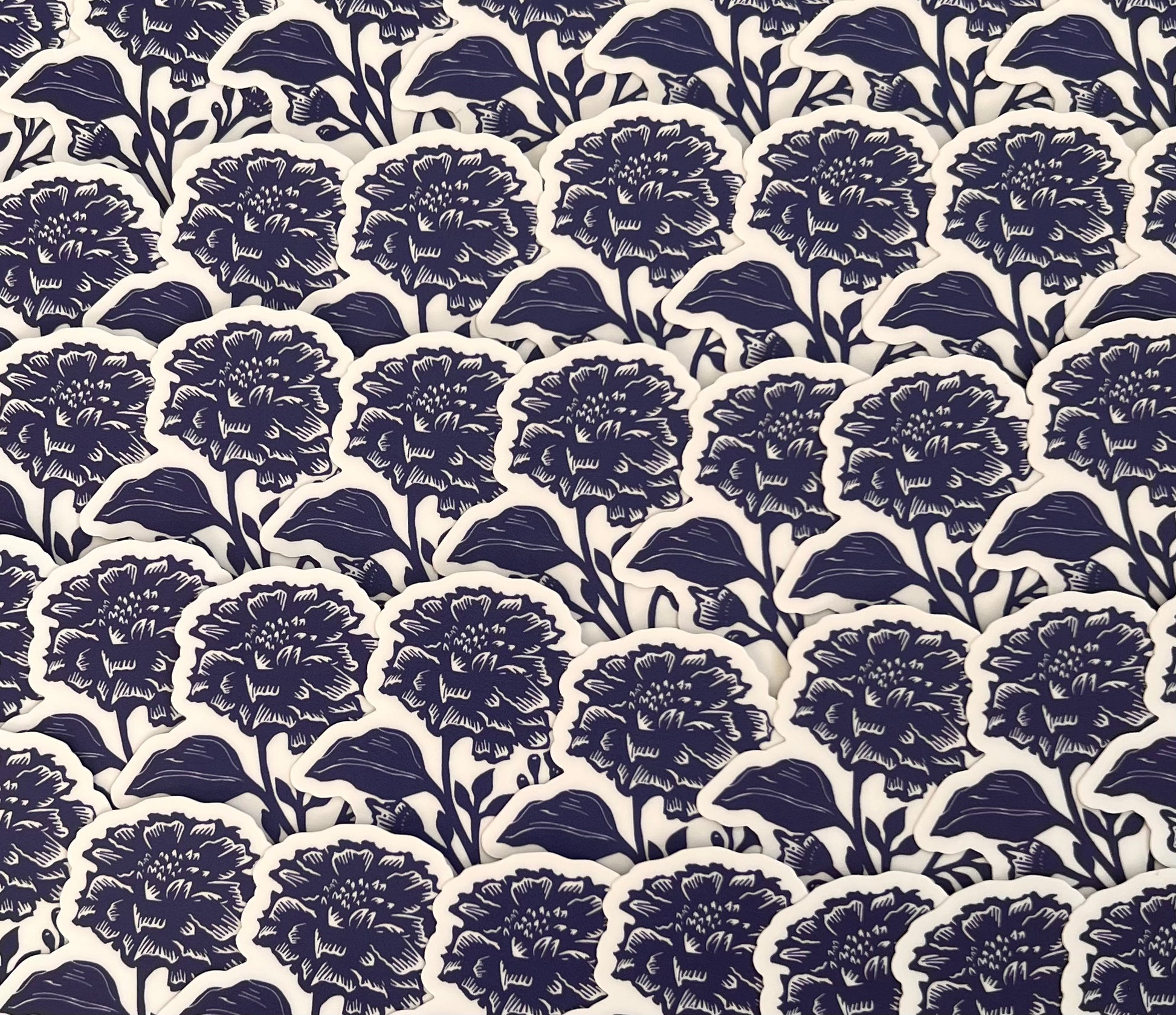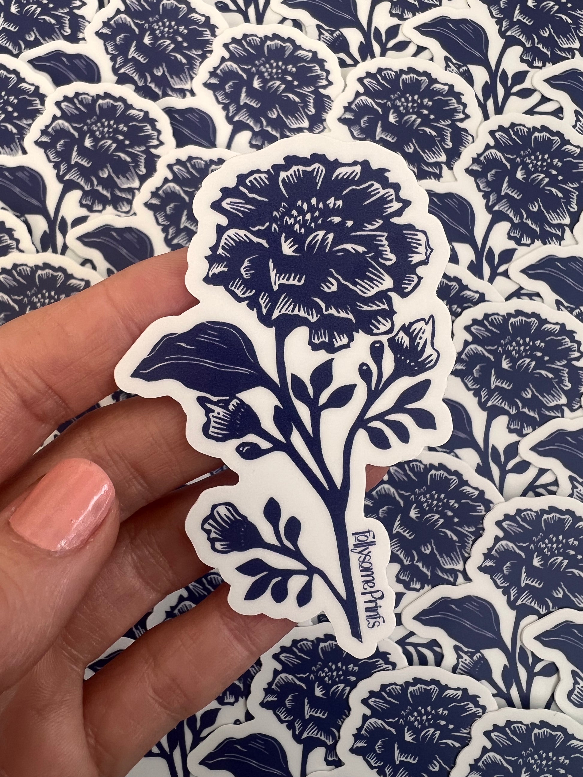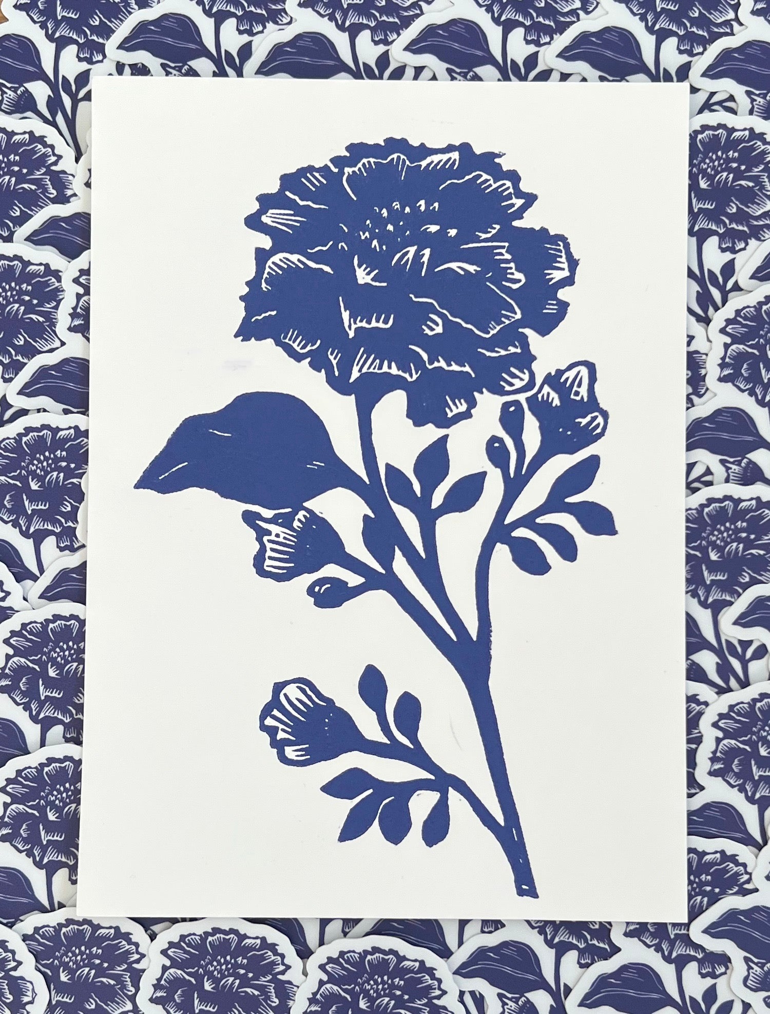 Original botanical linocut print that became a sticker, in an exquisite Delft blue.