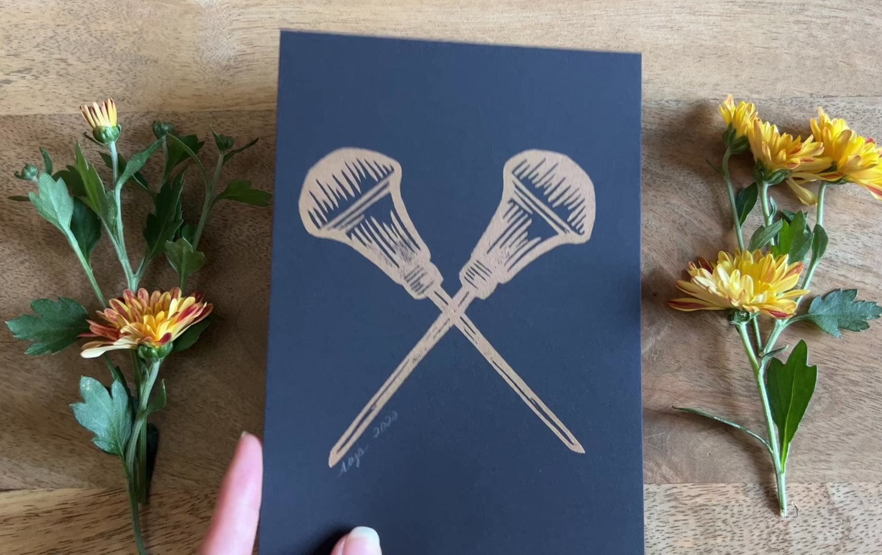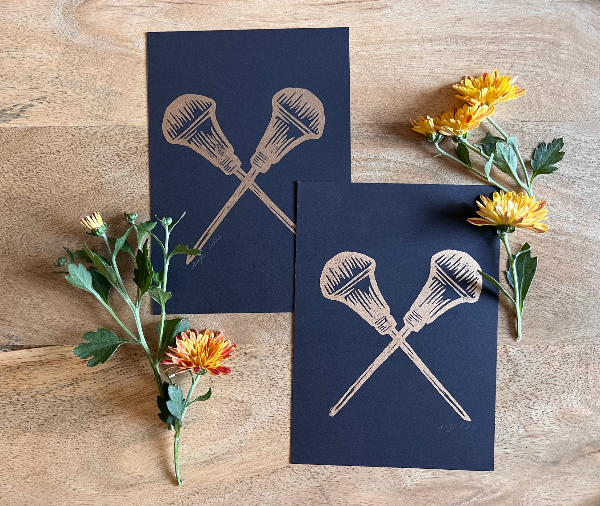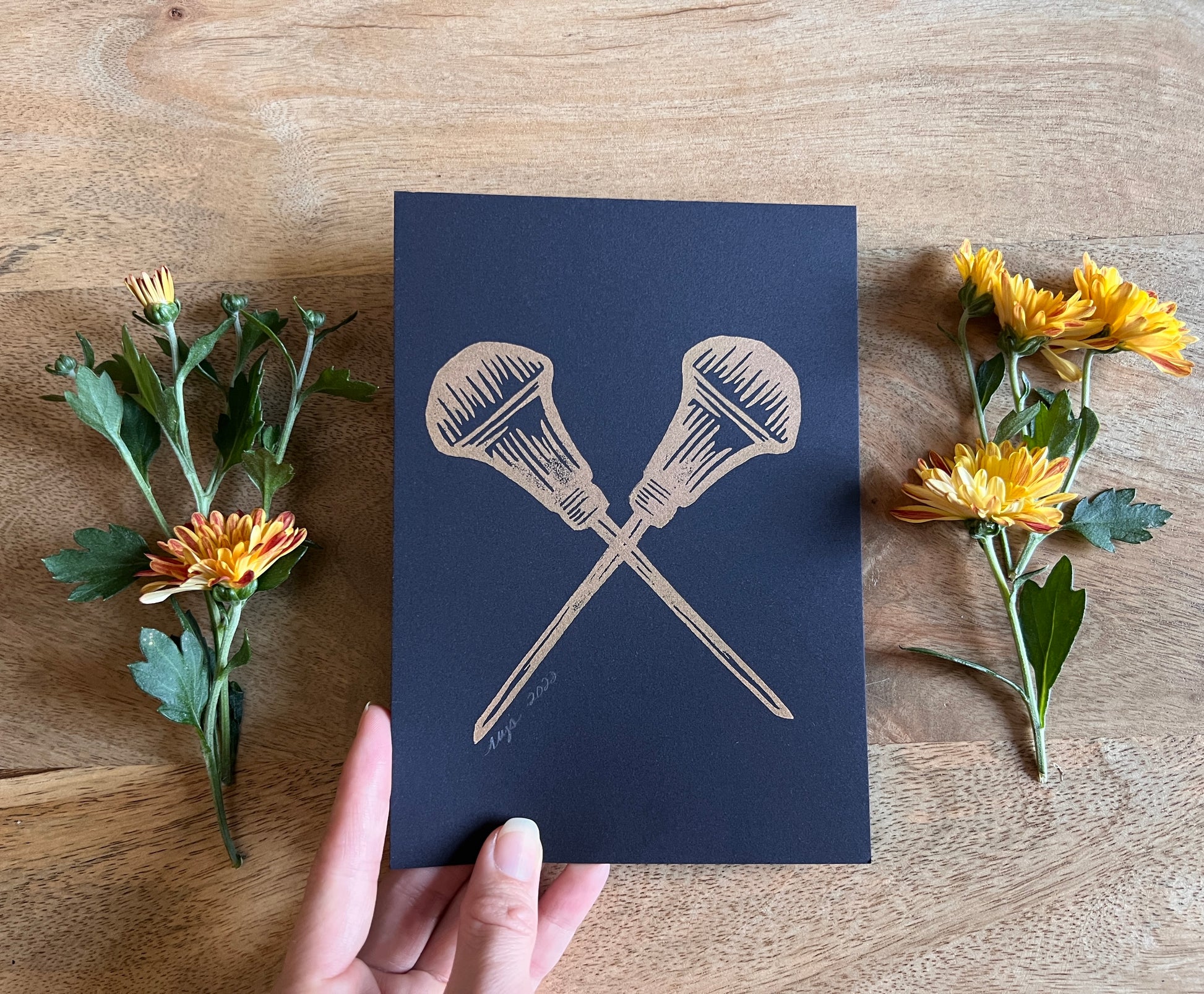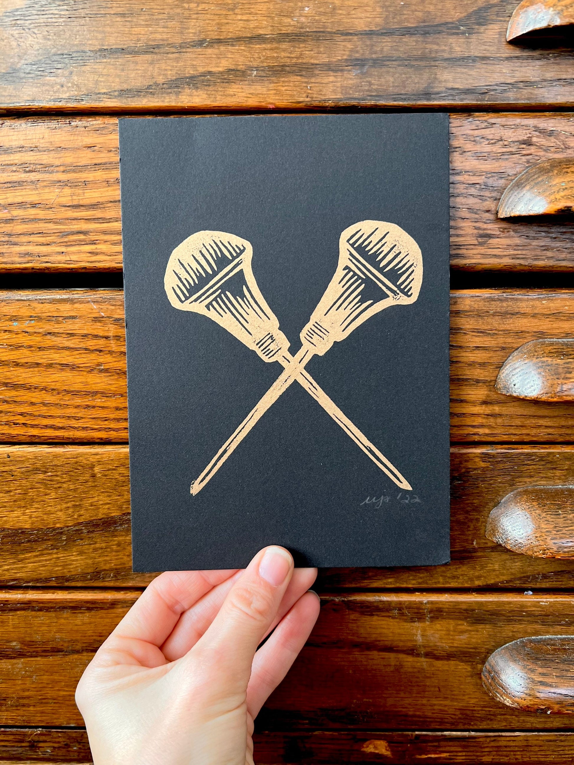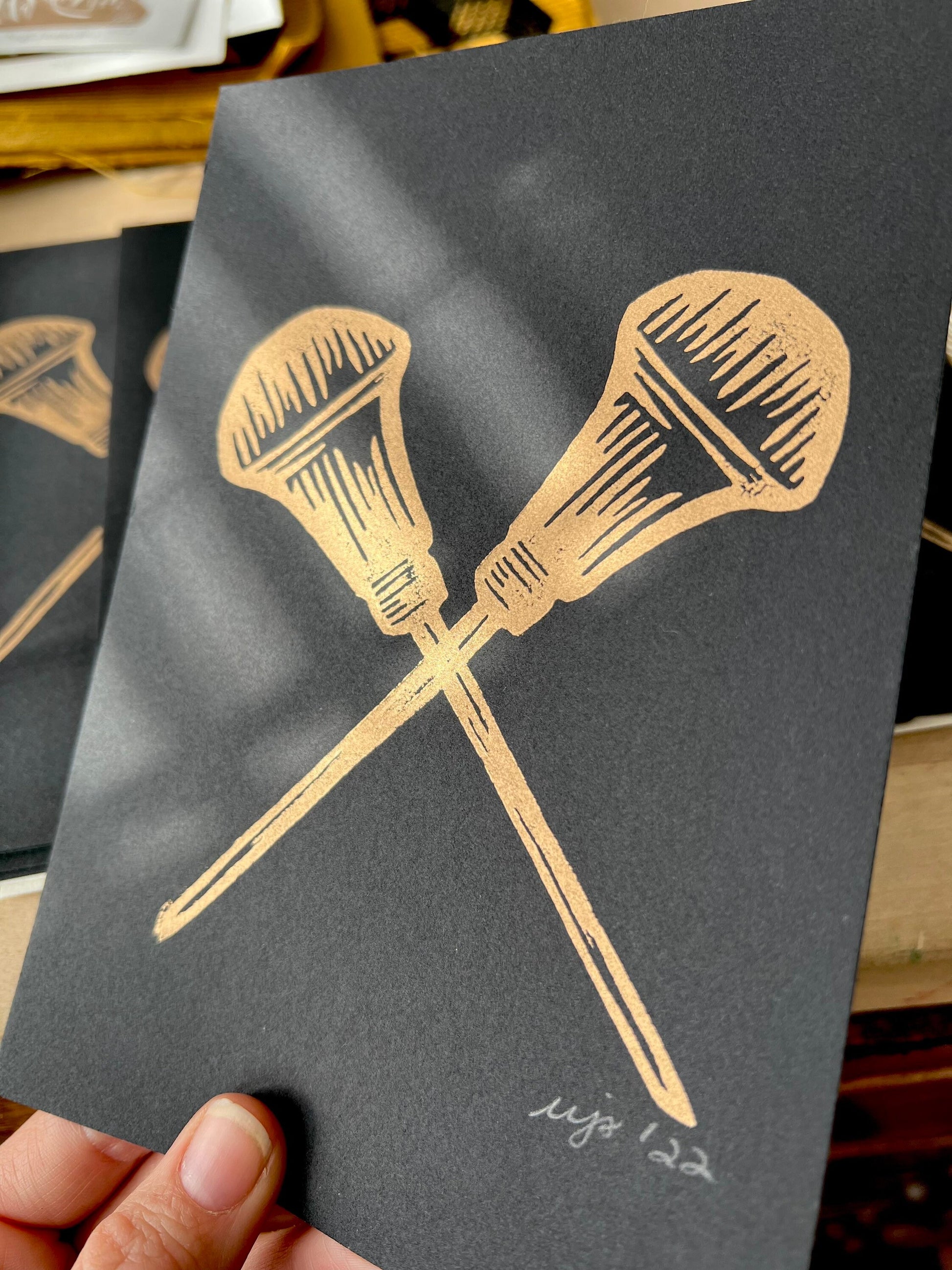 This original piece of art was created in the tradition of hand block printing. The block began with an original illustration. The block was carved and printed twice. Black cotton paper is printed with gold traditional relief ink. Limited edition available, initialed and dated by the artist.
