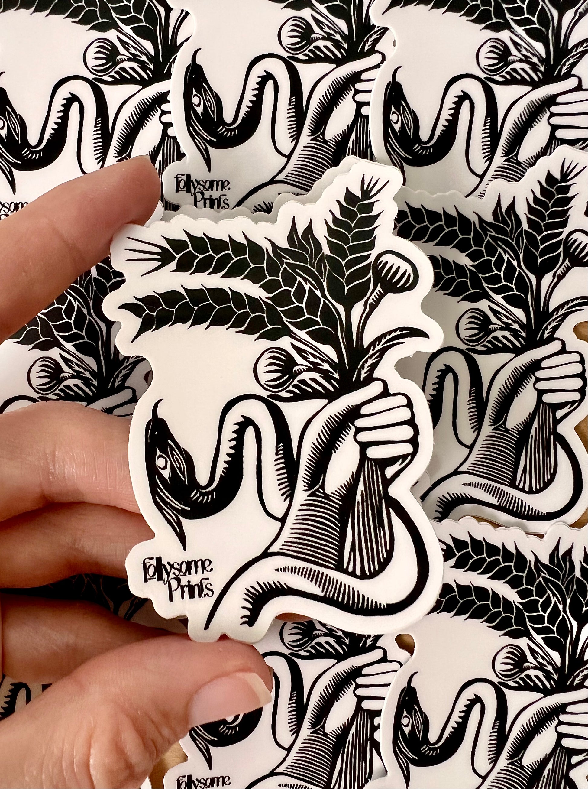 Original linocut illustration was drawn directly onto a printers block and turned into an all weather vinyl sticker. Perfect for water bottles, laptop, vehicle, or wherever you need to stick some original artwork to enjoy every day.