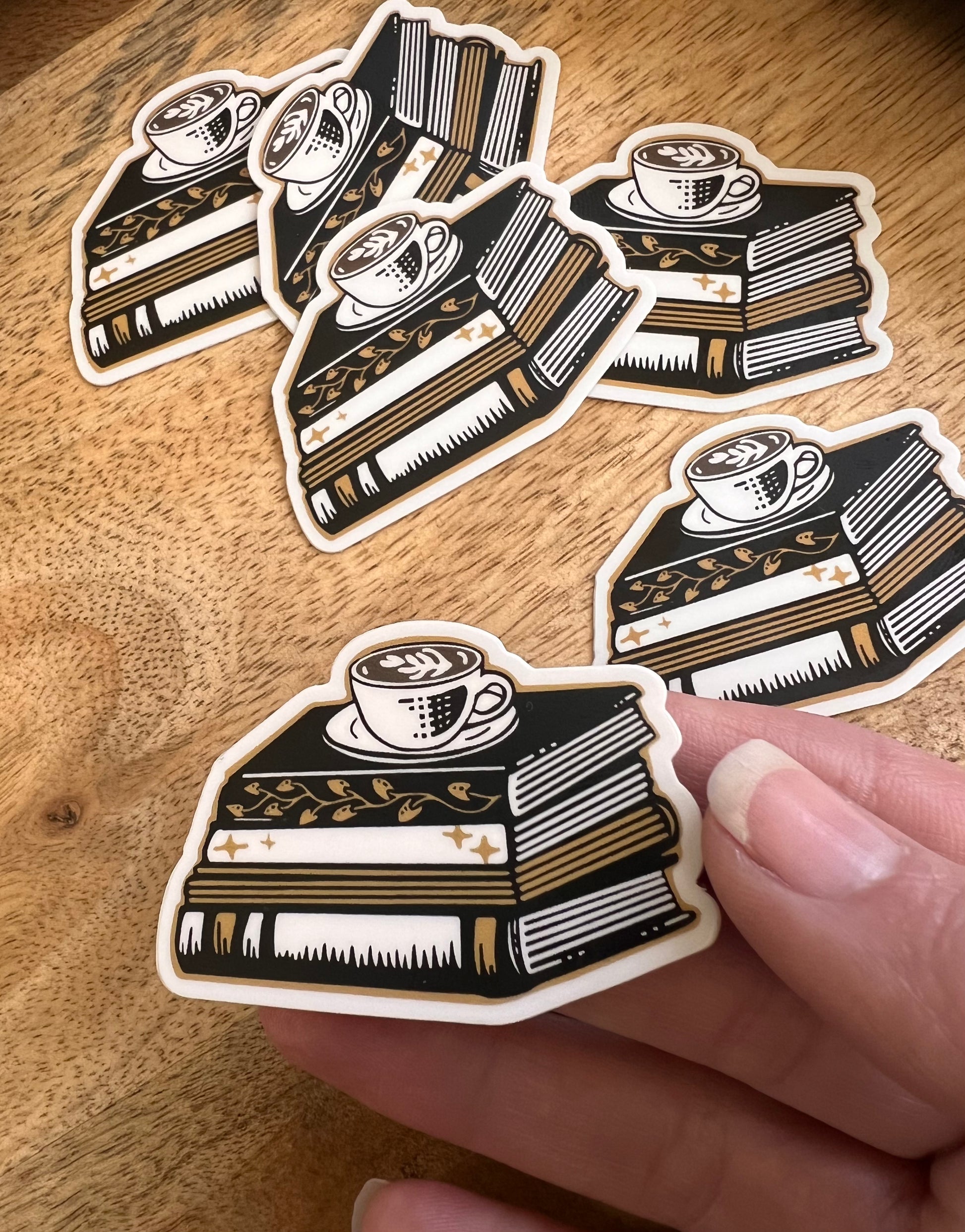 Ships as a standard letter, US First Class Mail or ships free with any other purchase. Original illustration was drawn of latte art atop a stack of books because what could be more cozy?
