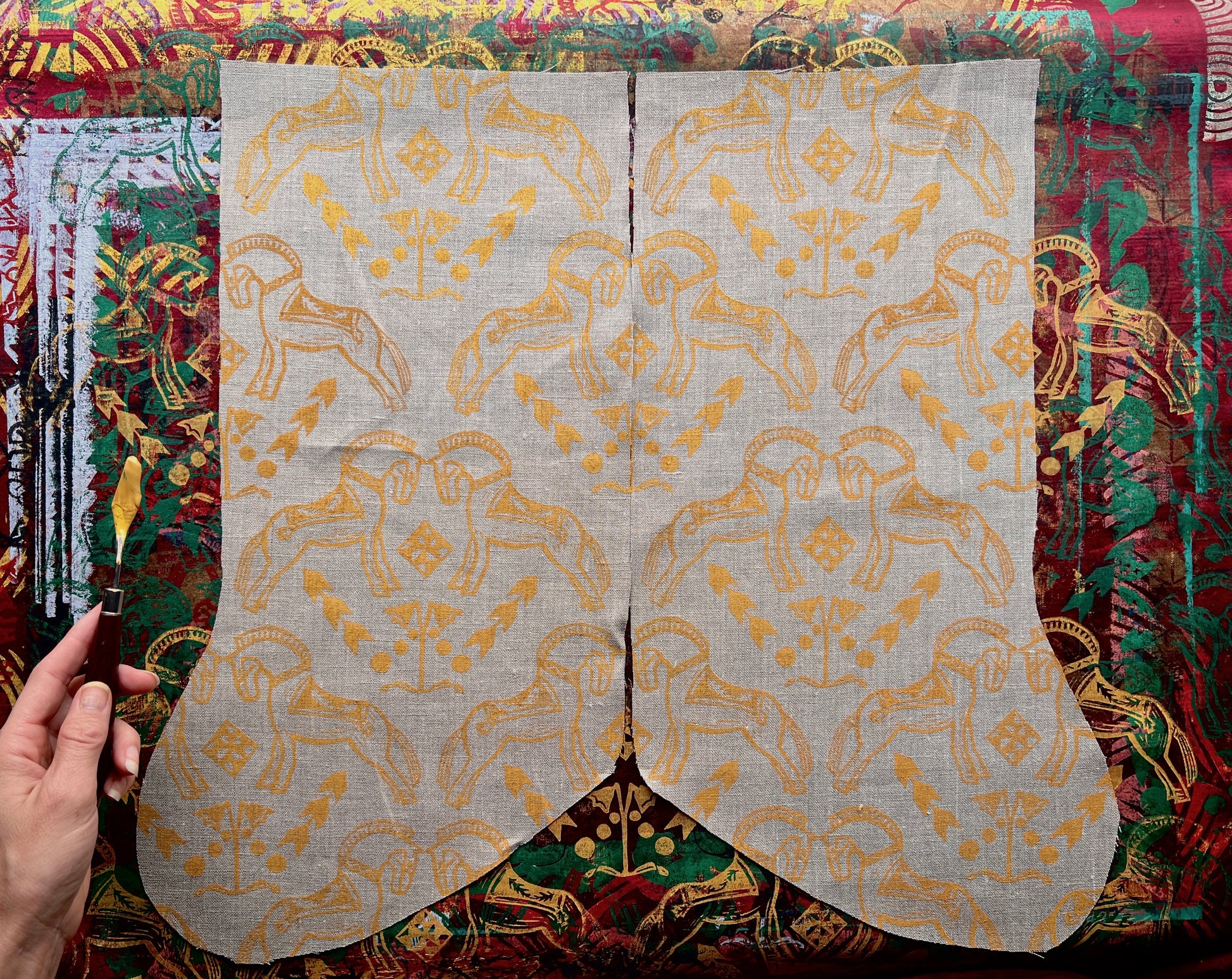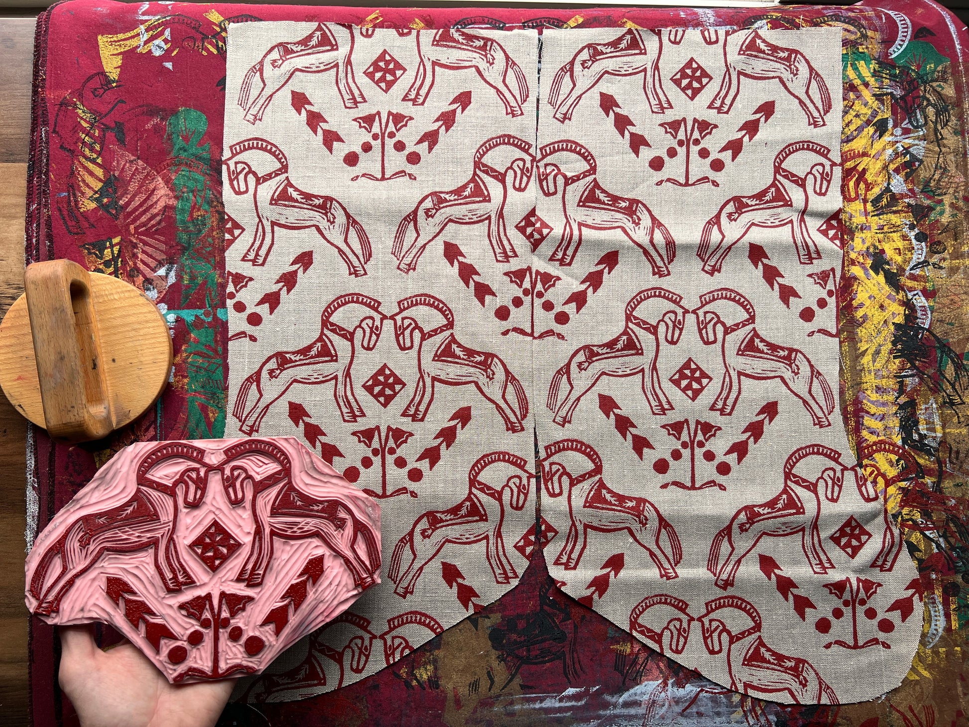 The pattern is printed from my hand carved block and printed with wash safe, nontoxic textile ink.
