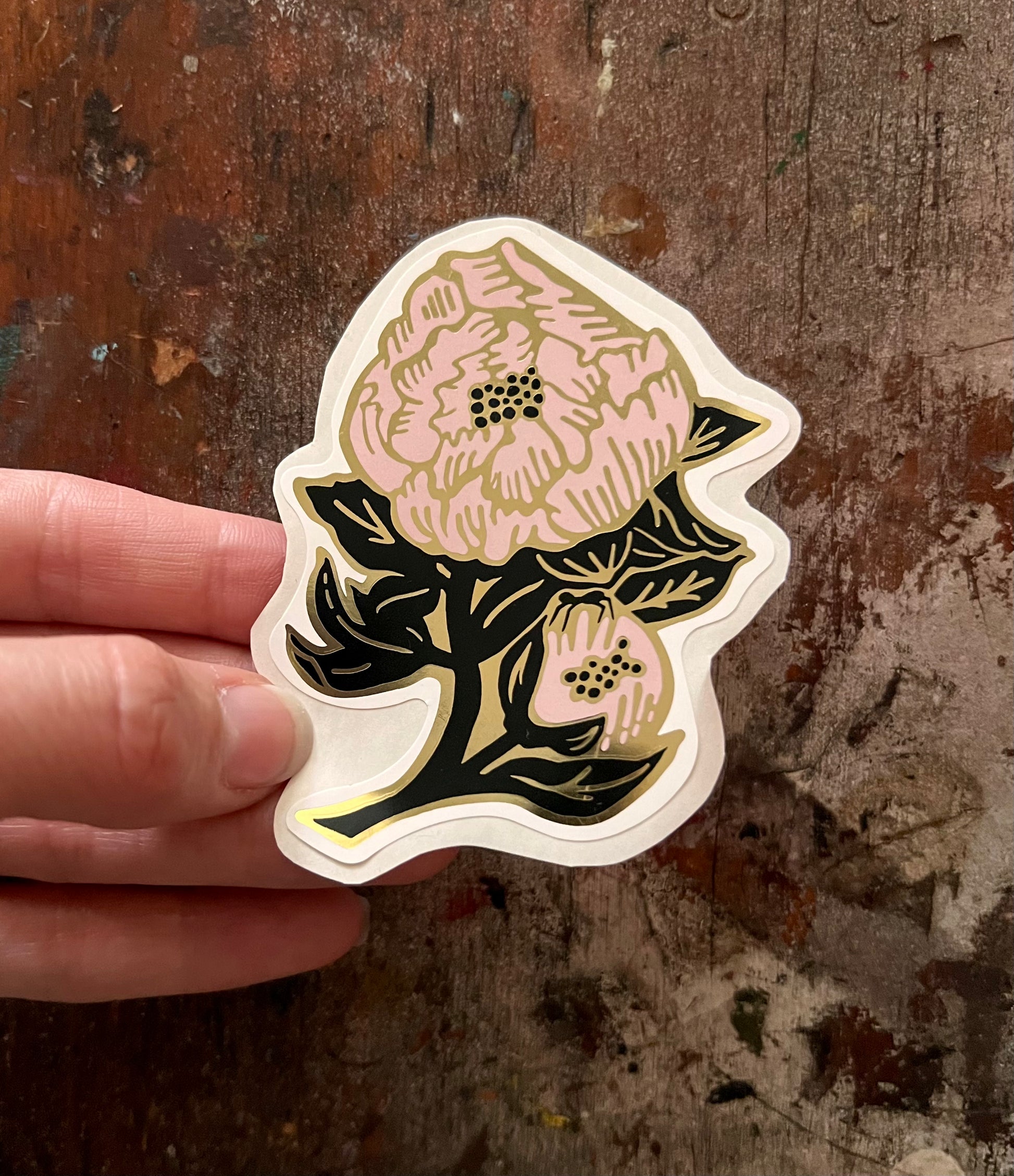 Gold foil glistens on these 3x3” stickers featuring my original illustration. Spot the ant hitchhiking on the smaller bloom!