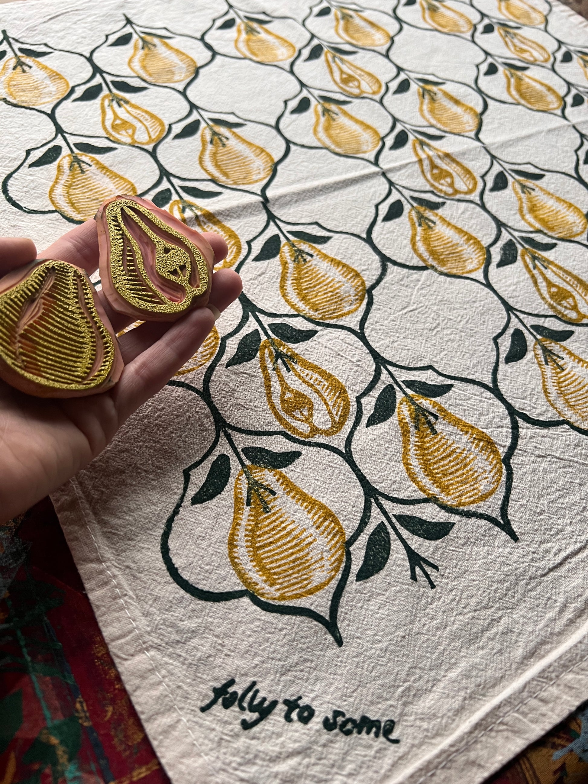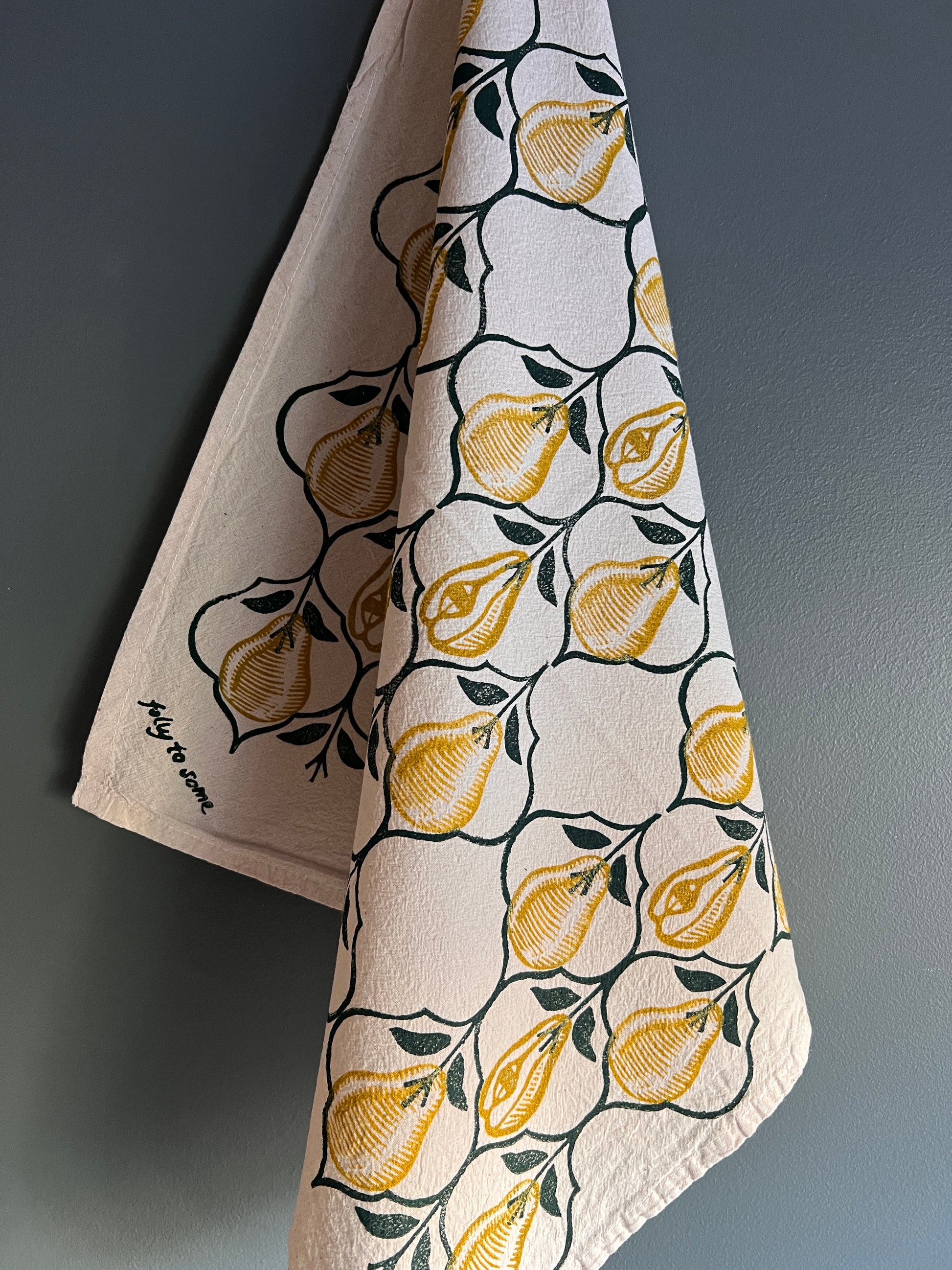 Golden pears printed on natural cotton 20” tea towels.