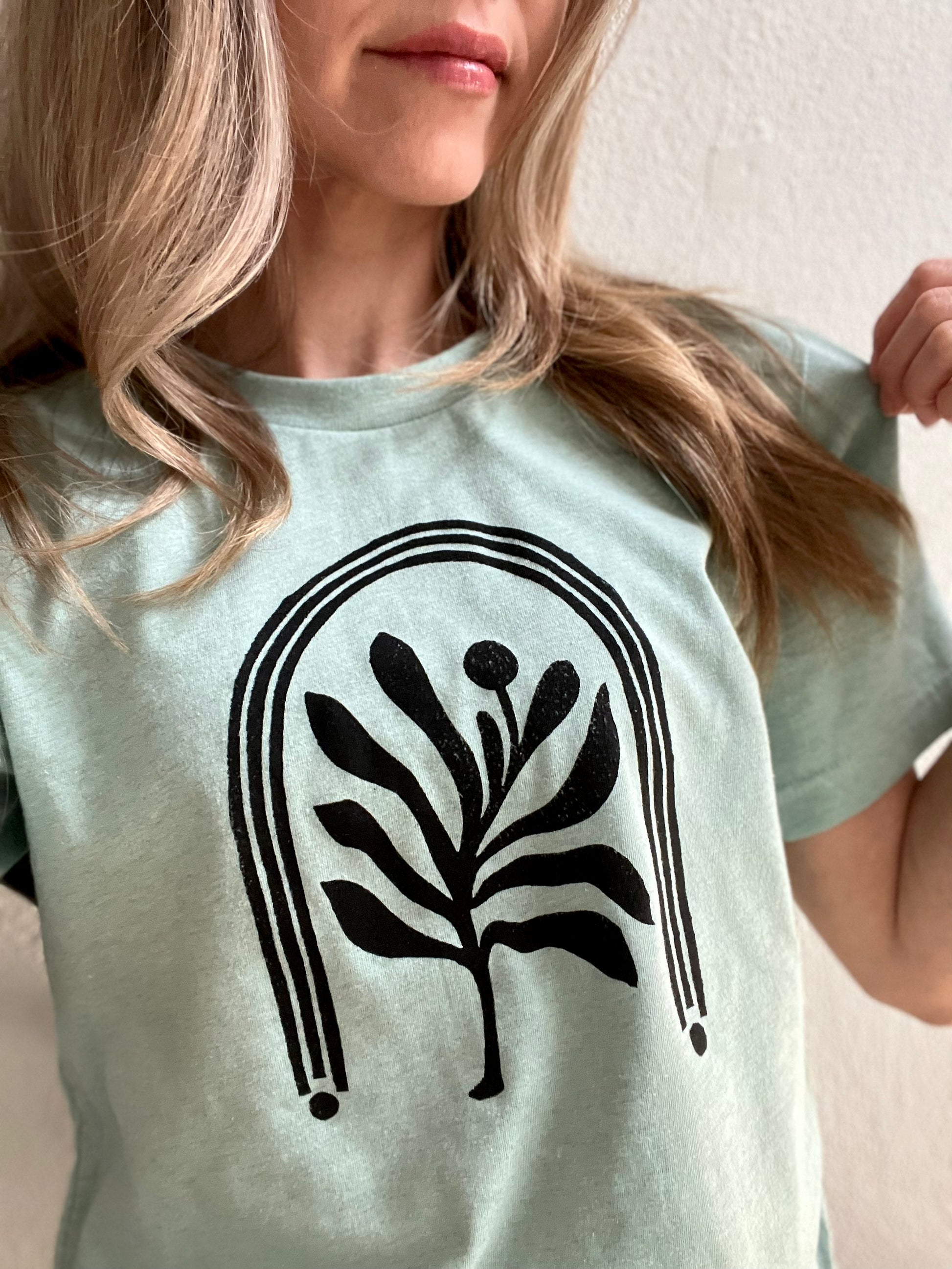A botanical and geometric motif on a Dusty Blue tee, 100% cotton and unisex size.
