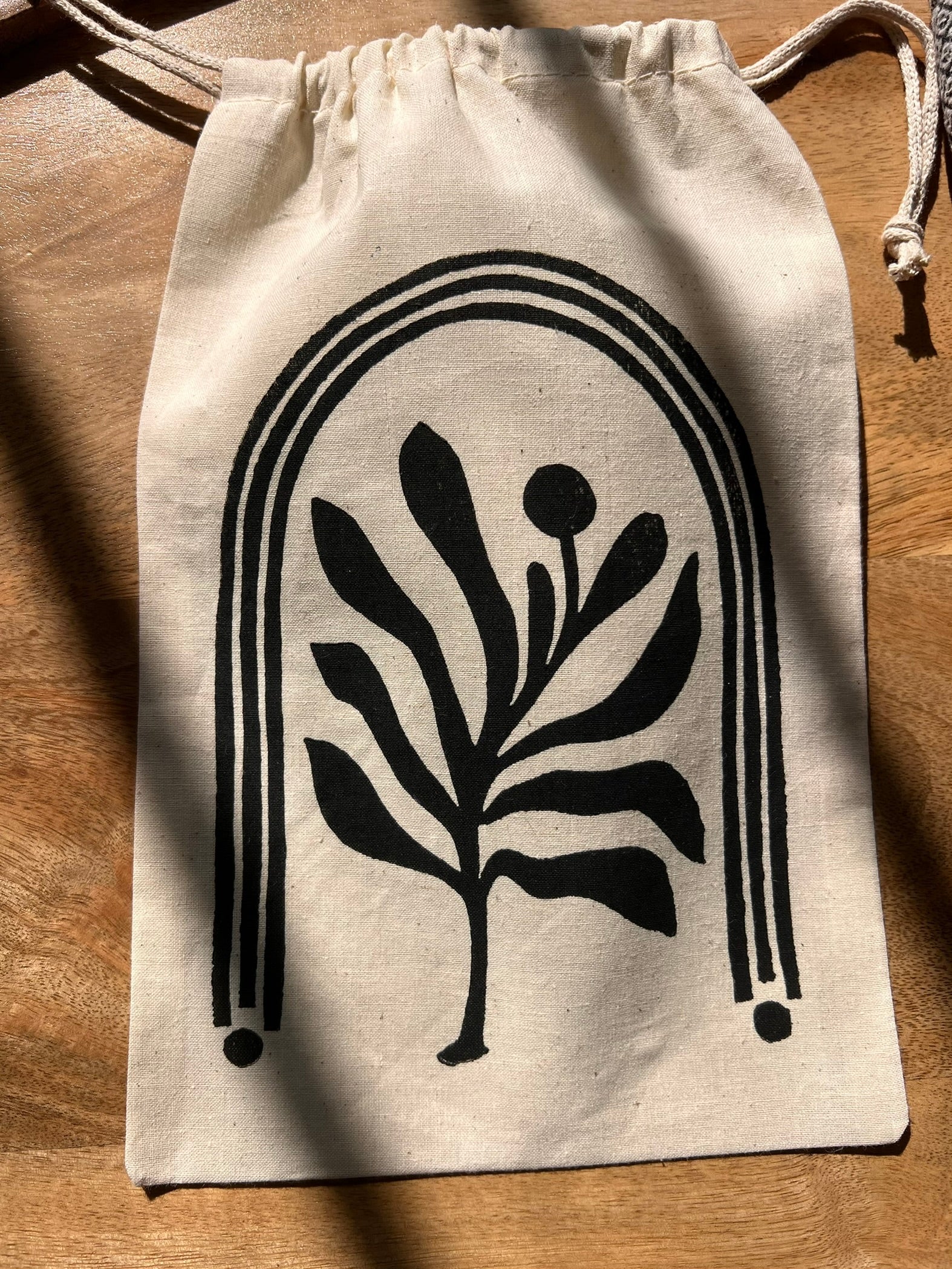 A perfect gift bag for little goodies, these are all cotton cinch sacks block printed with my original illustrated design inspired by the tenacity of weeds.
