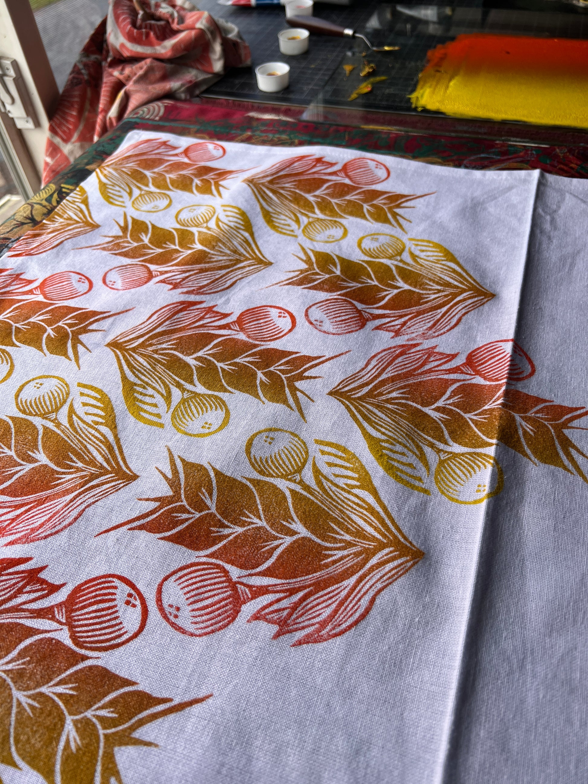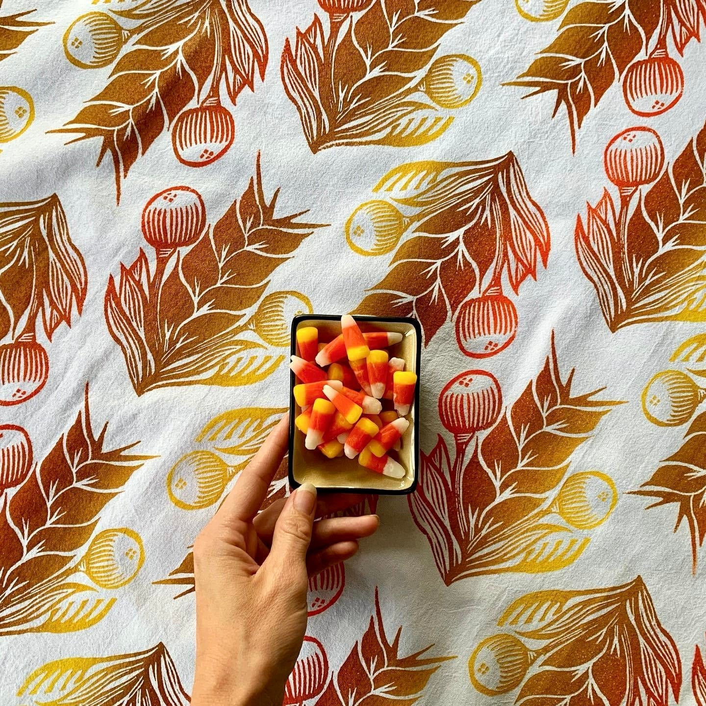 Heavyweight cotton tea towels measure 20x28” inches square with a hanging loop. Each tile is individually printed by hand with rich pigment textile ink. Ink is well set and washable, much went into making sure these towels can be loved and used for real life and still look great. Art for everyday life!