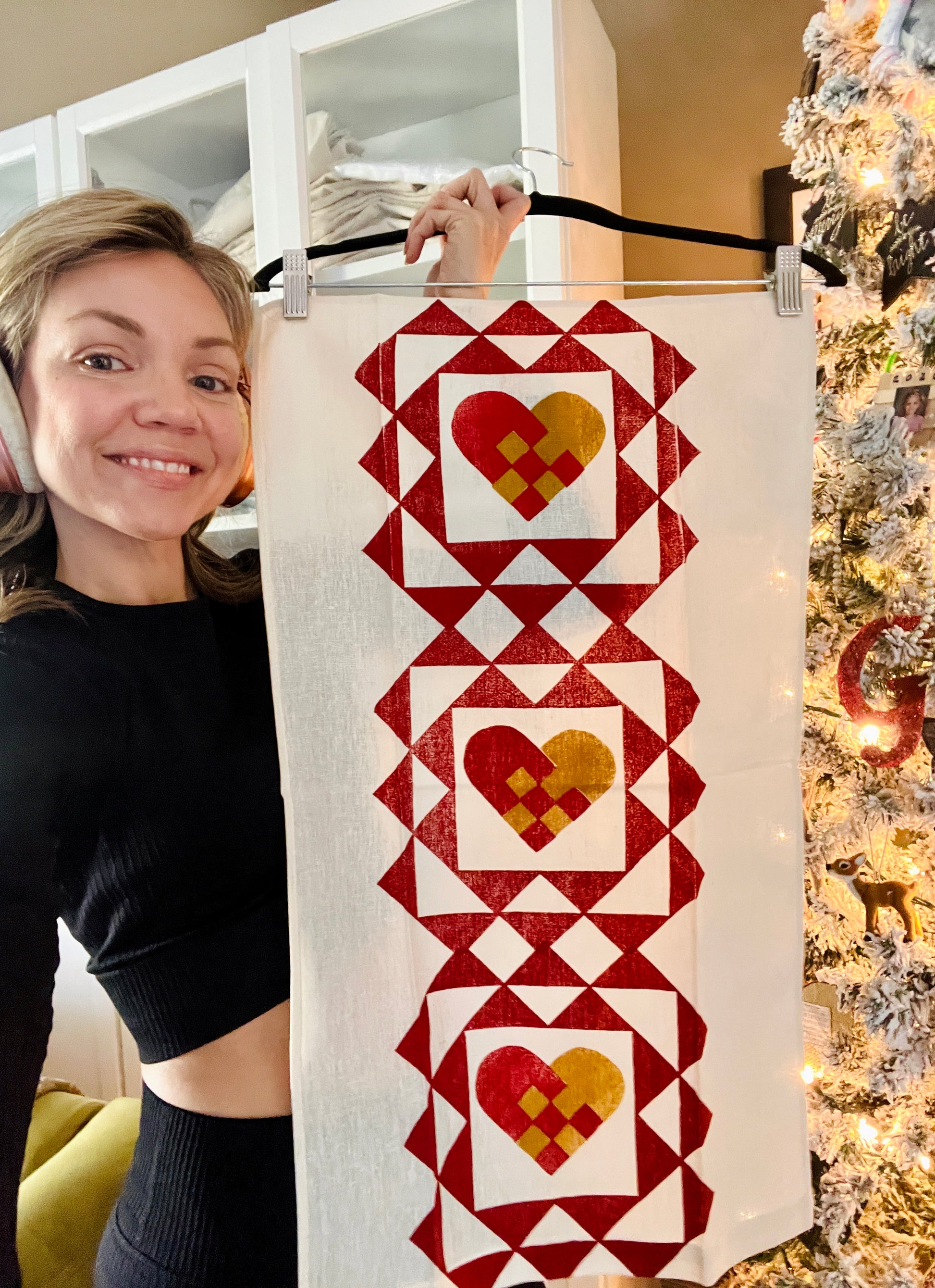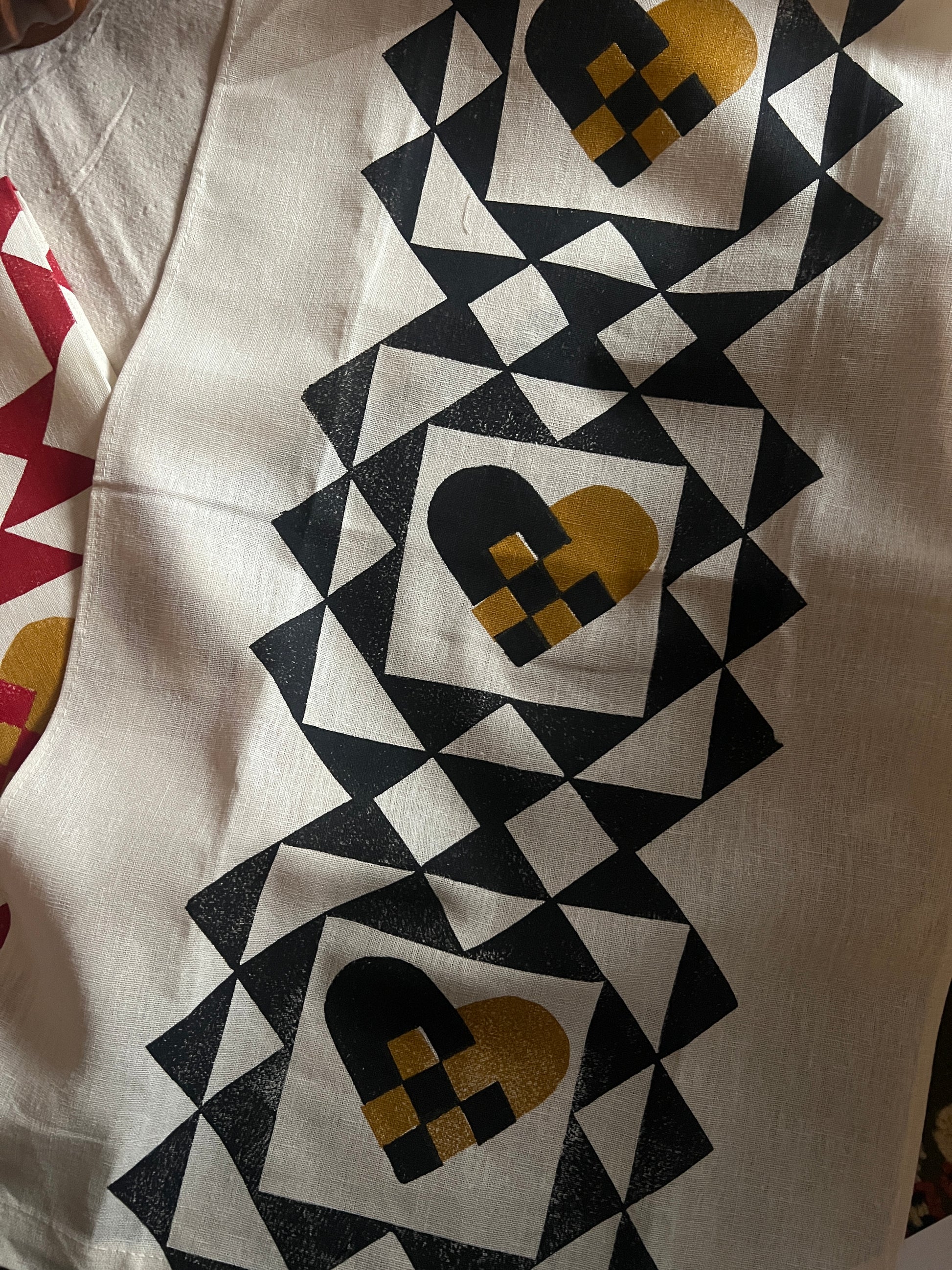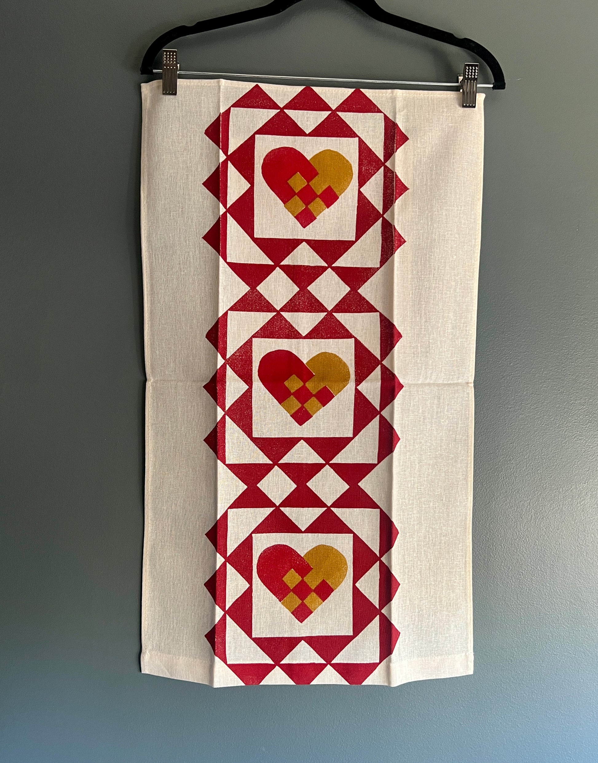 A Traditional quilt pattern hand printed on a natural linen hand towel.