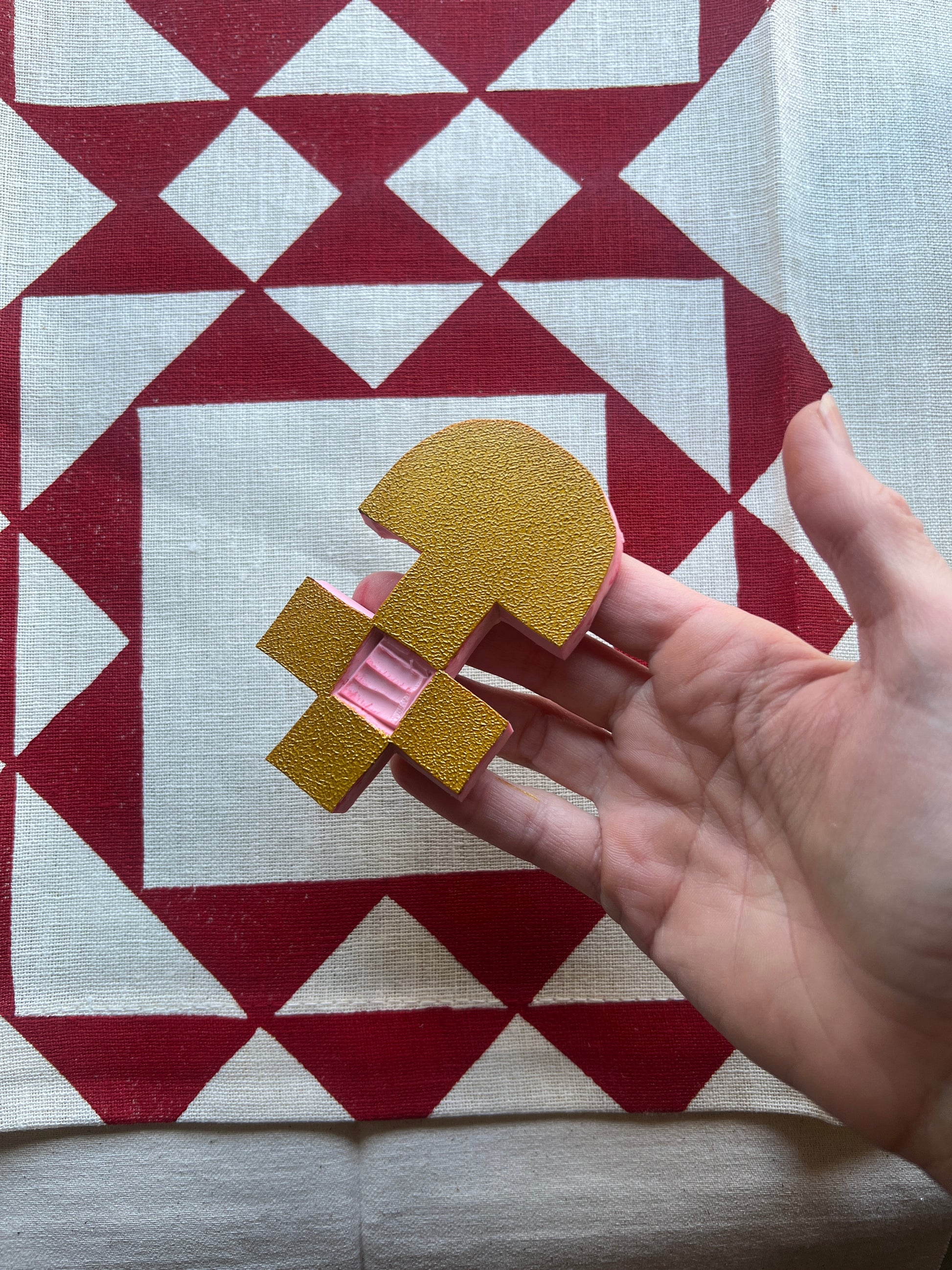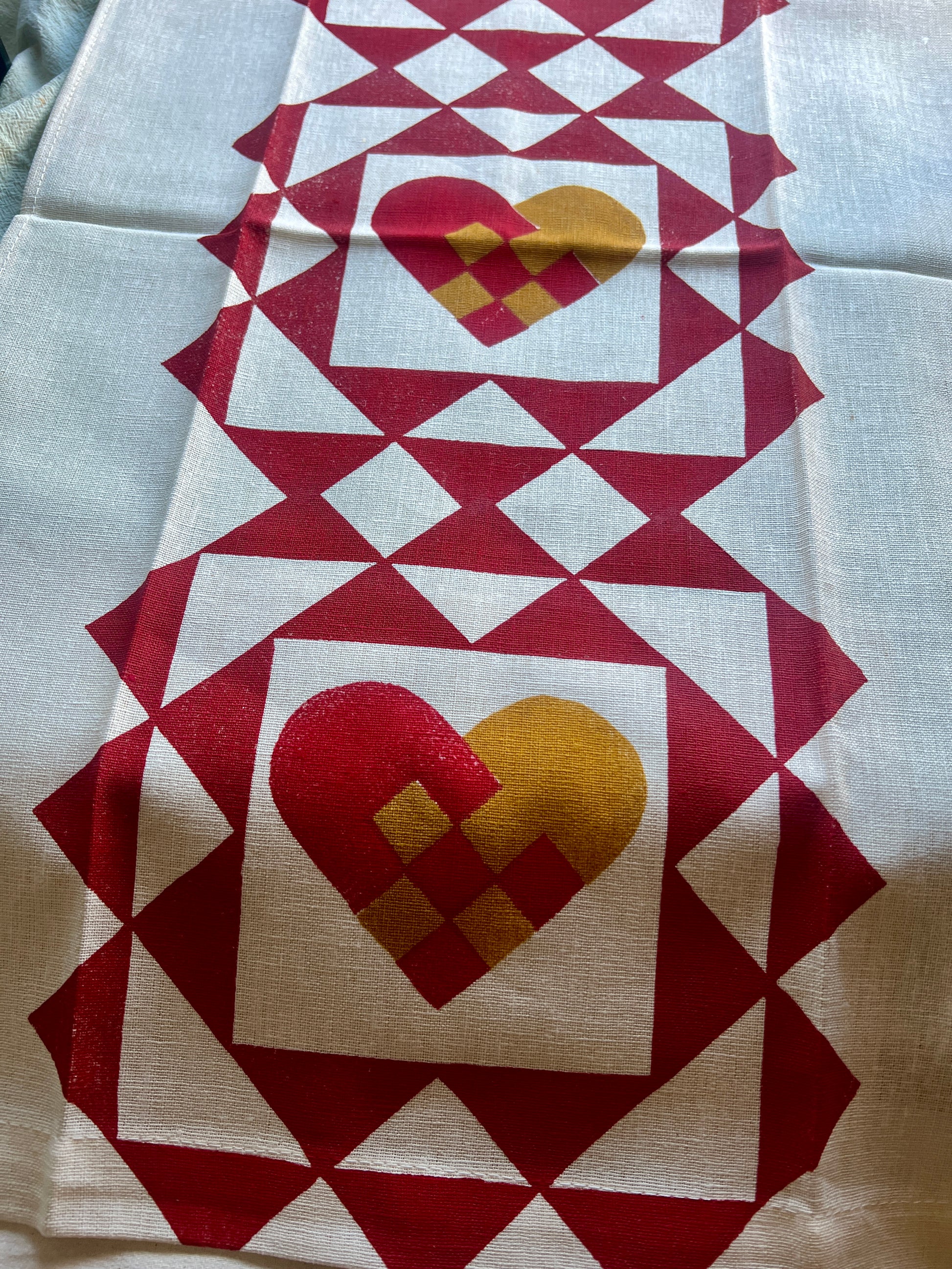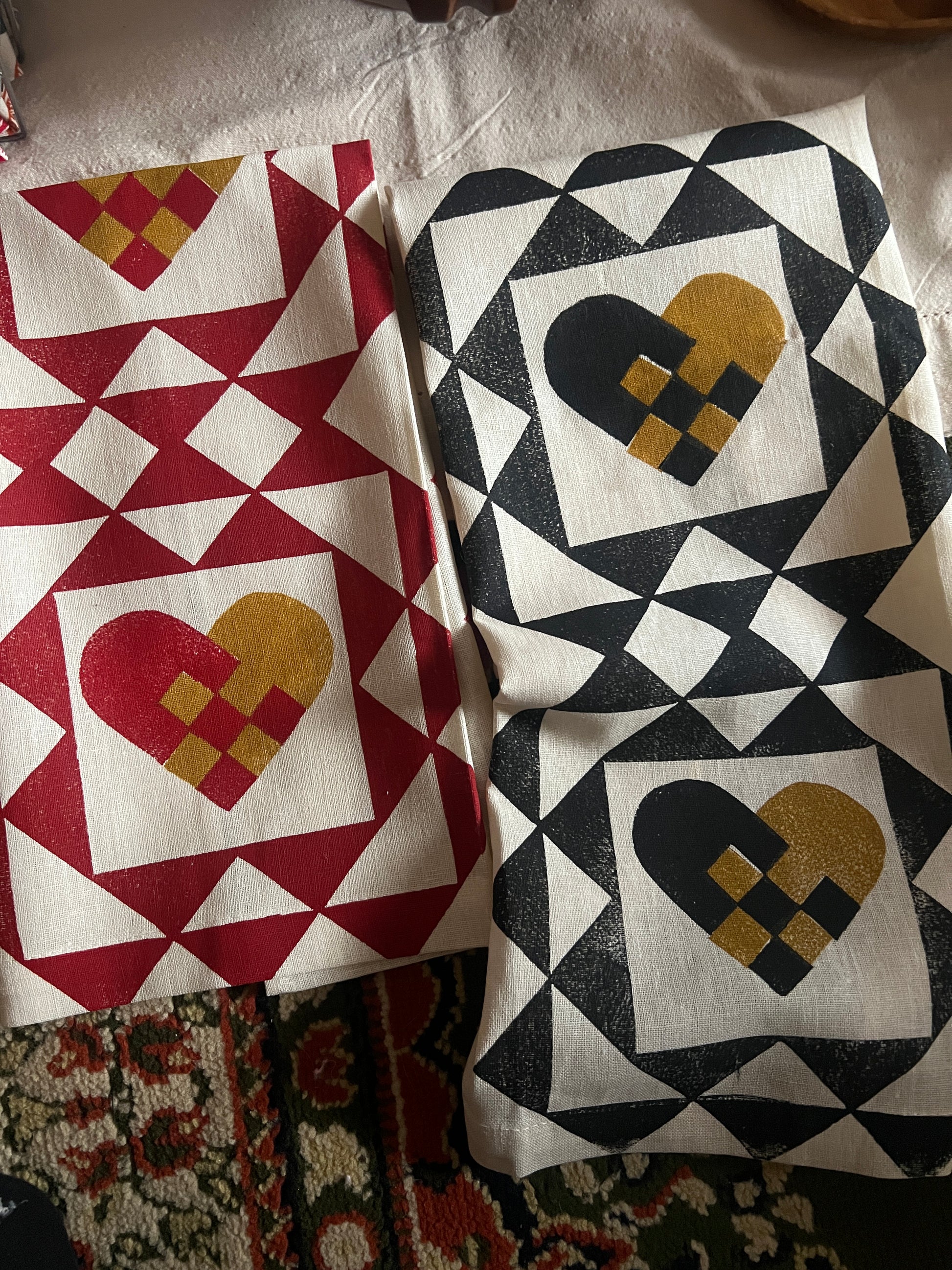 A Traditional quilt pattern hand printed on a natural linen hand towel.