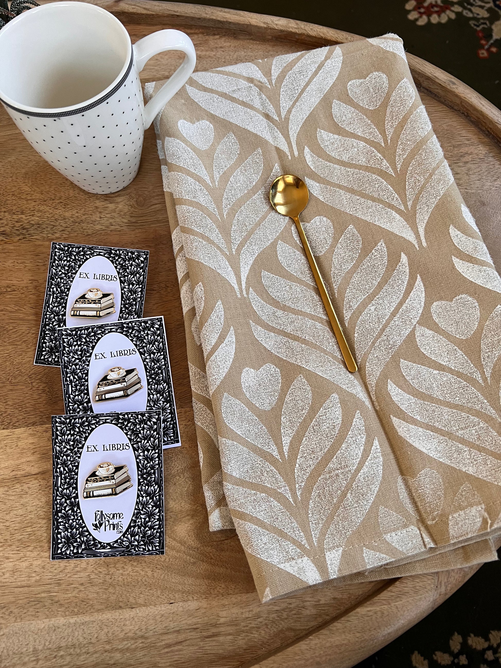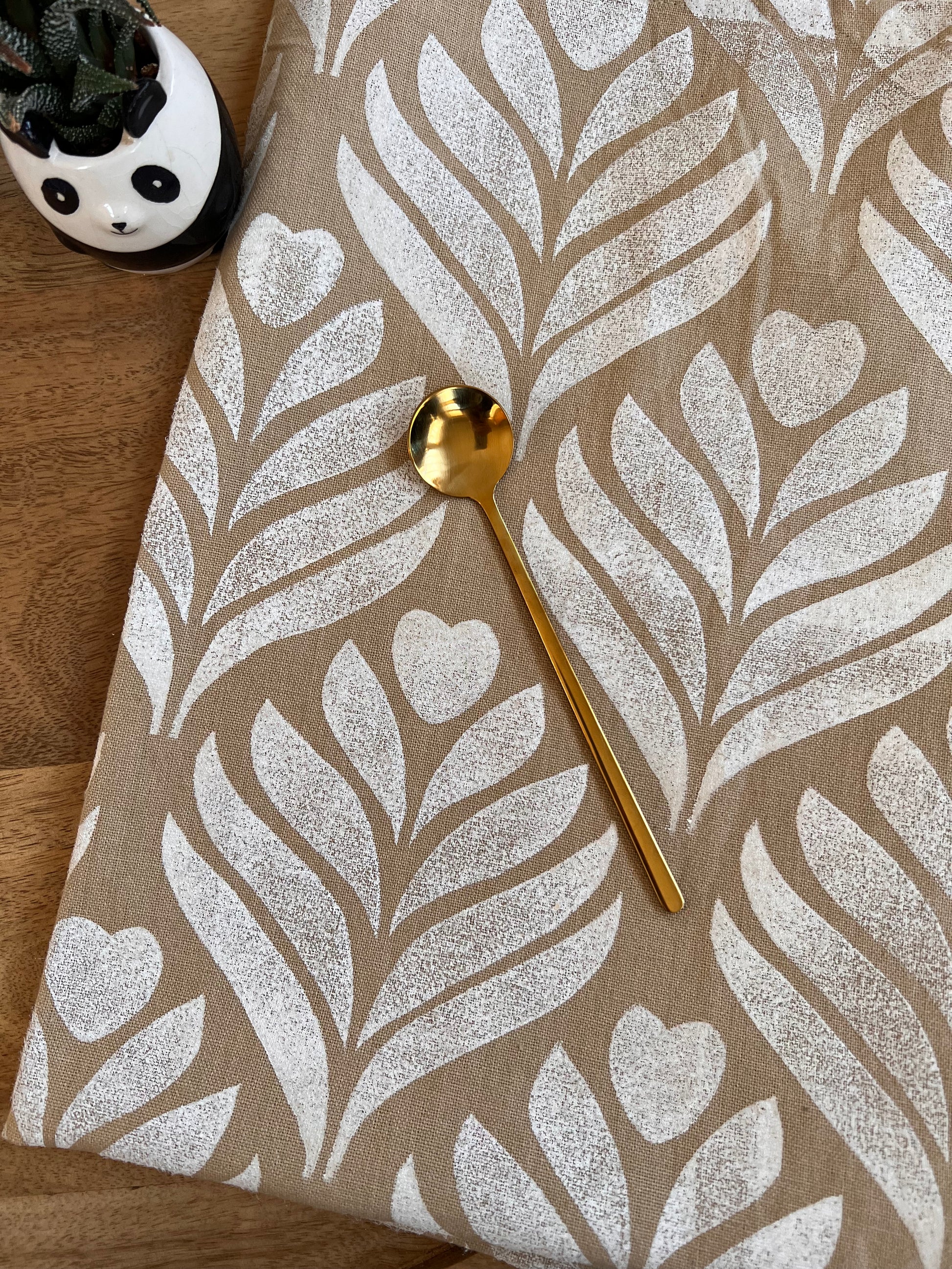 For the love of coffee, a hand carved printers block printed in an edge to edge pattern. Each impression is inked and pressed individually. Featured in white ink on beige color heavy weight woven cotton, approximately 20x28” with a hanging loop. This is the perfect width to display across the oven.