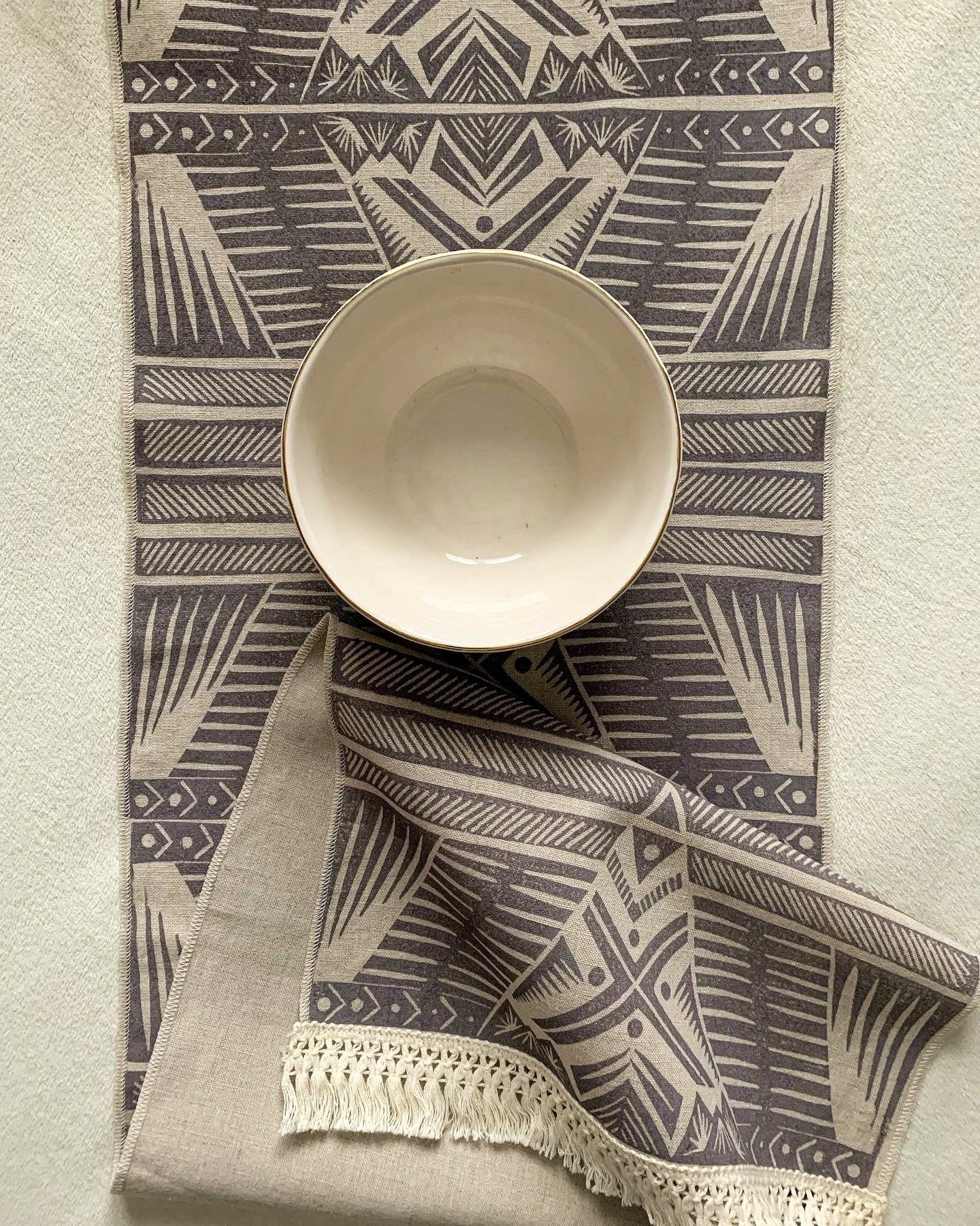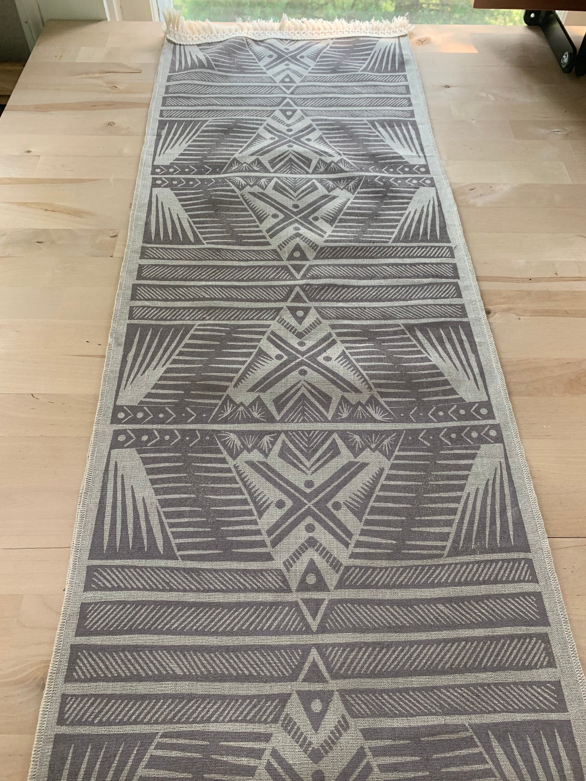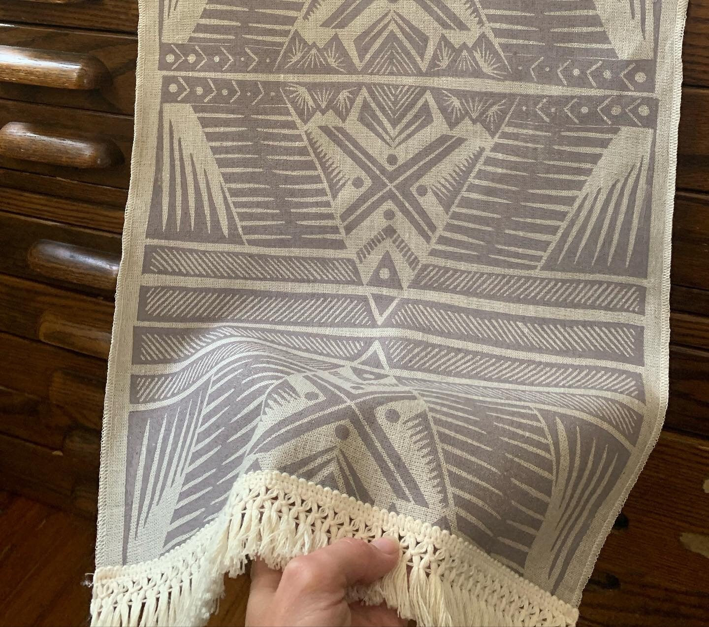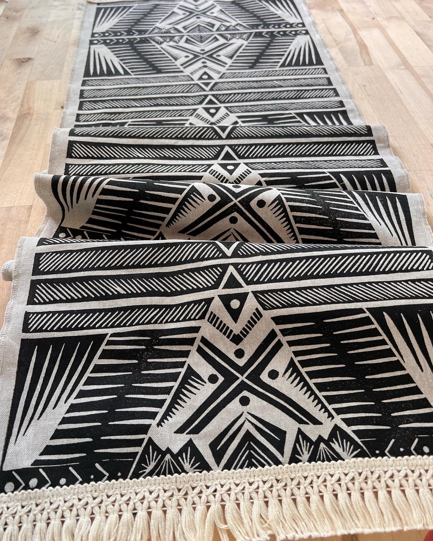 These linen blend table runners are hand printed with my original design. The design was drawn and transferred to a printer’s block, hand carved, and each tile is individually hand printed edge to edge to create a unique piece of art for your home.