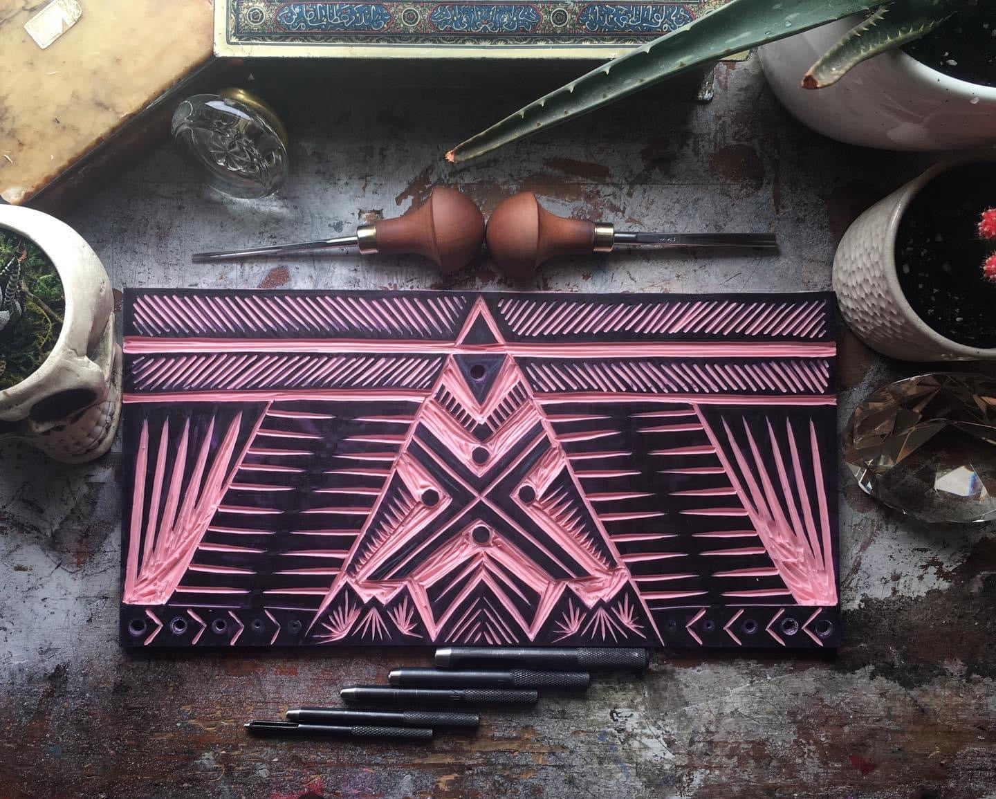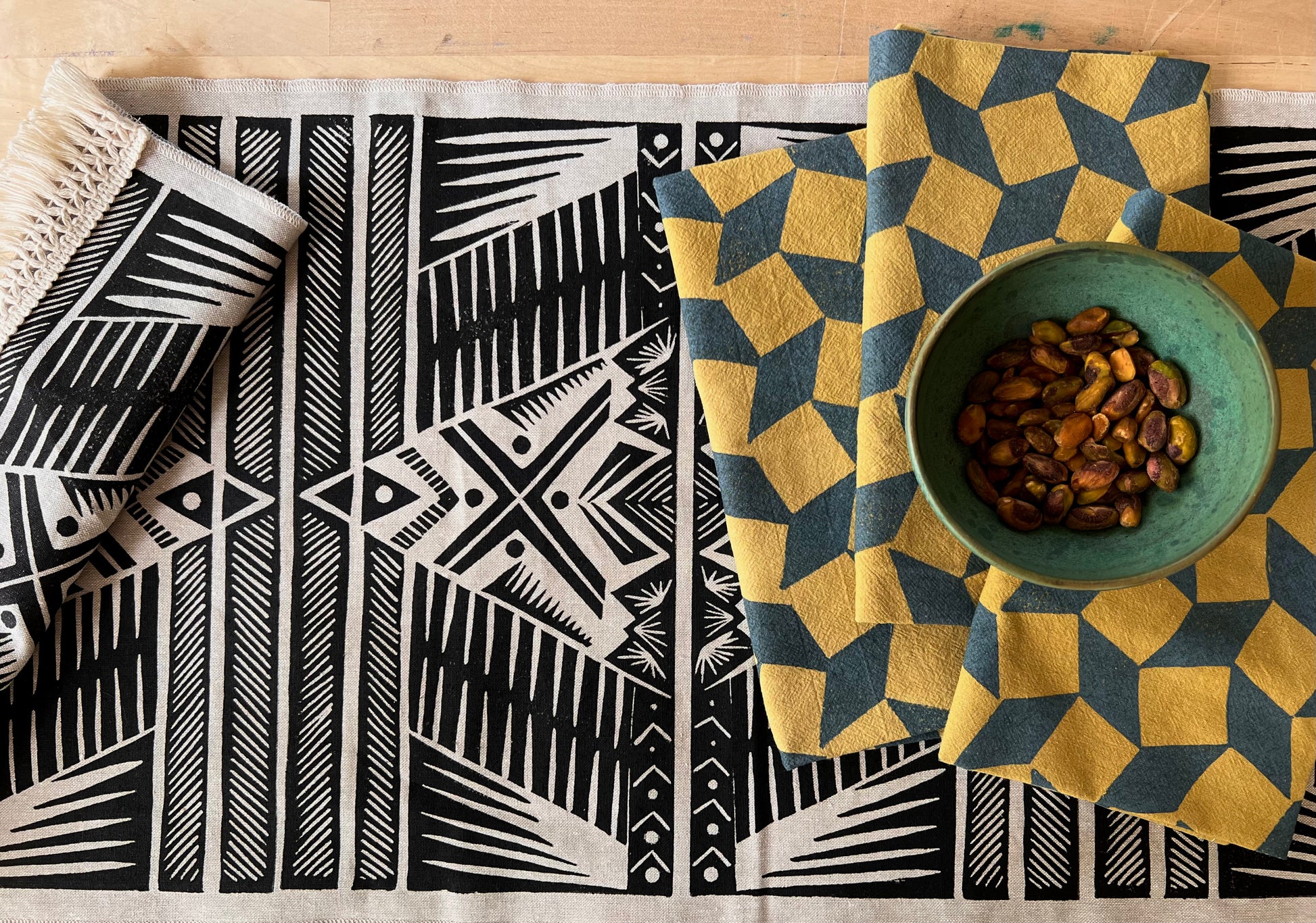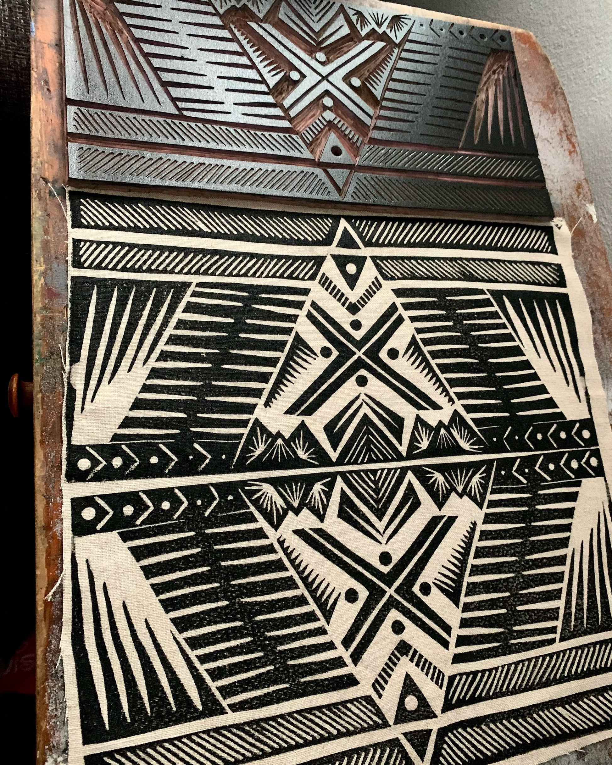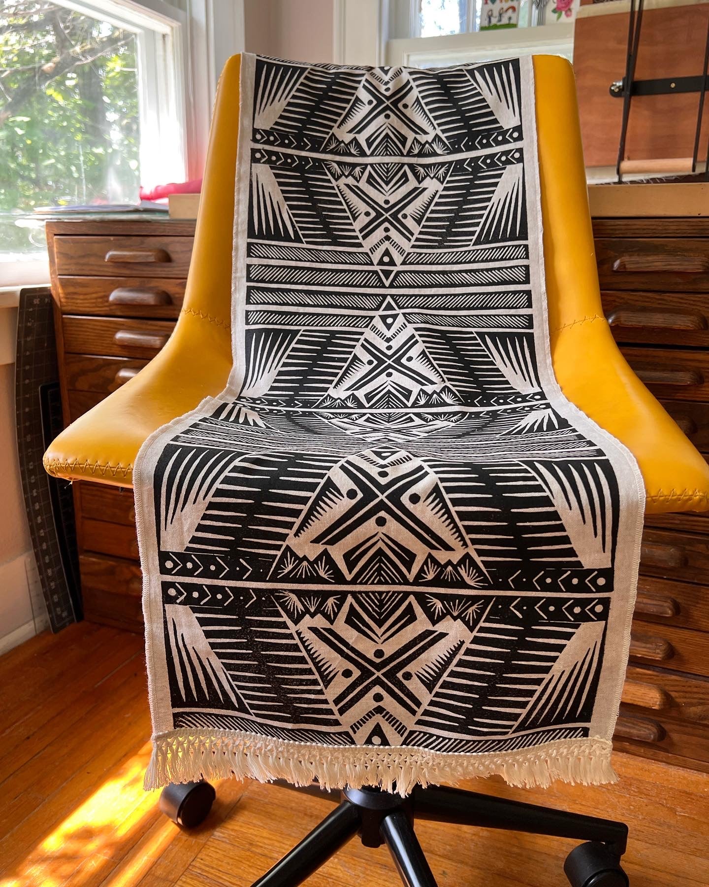 These linen blend table runners are hand printed with my original design. The design was drawn and transferred to a printer’s block, hand carved, and each tile is individually hand printed edge to edge to create a unique piece of art for your home.