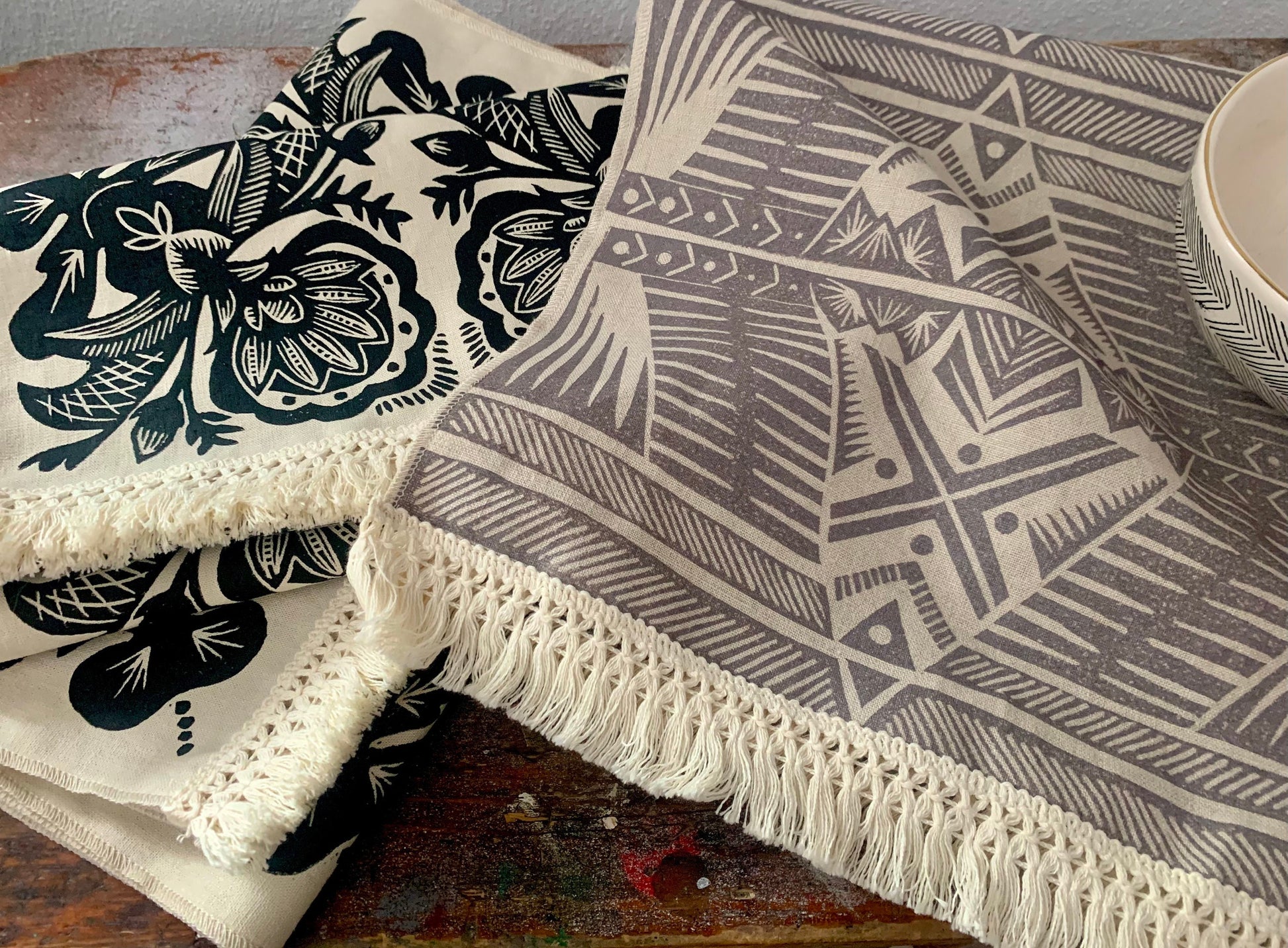 Natural tone linen is approximately 12-13” wide and several length options are available and includes fringed finishes. Featured in hand-mixed smoke or black ink colors.