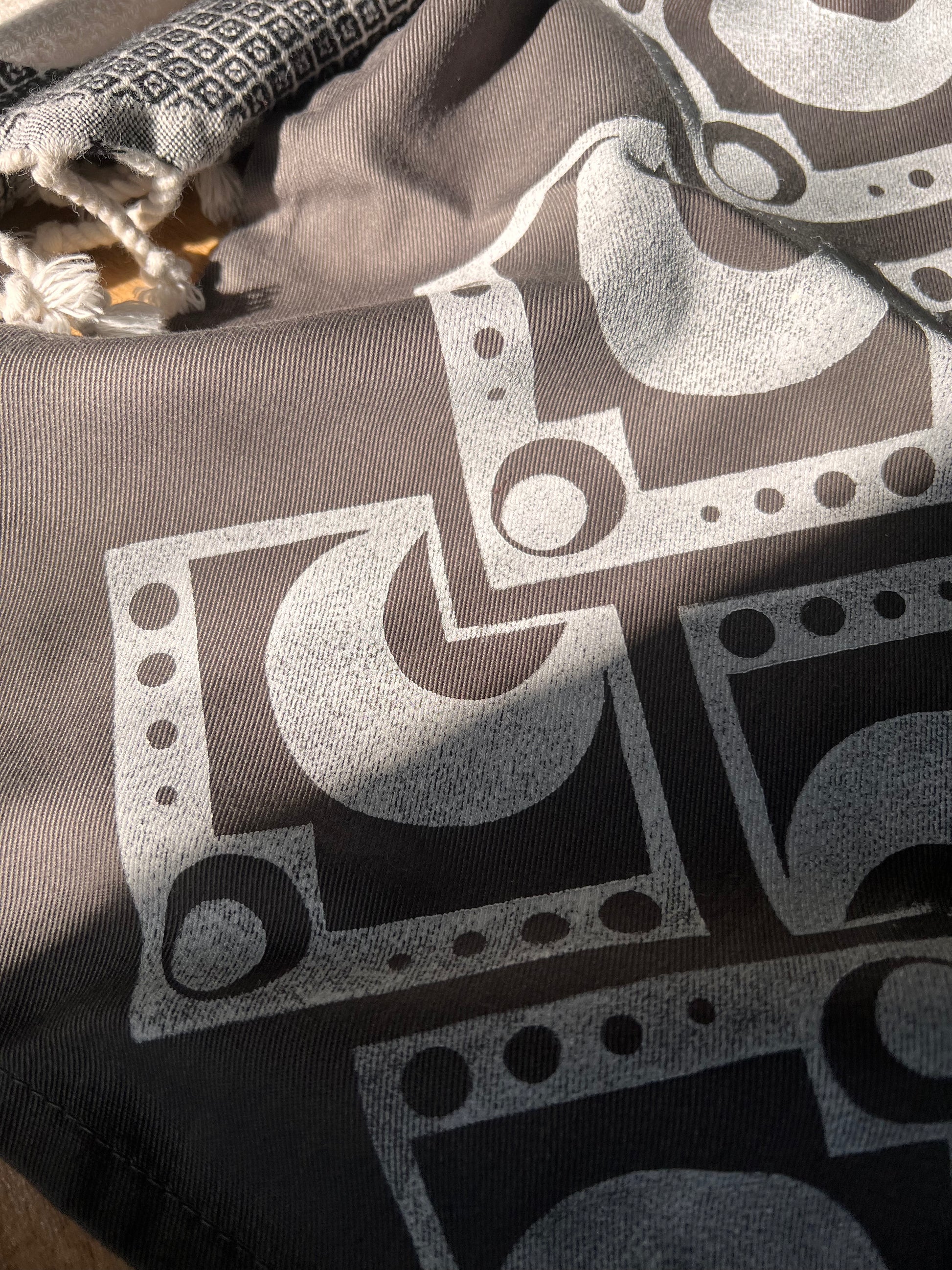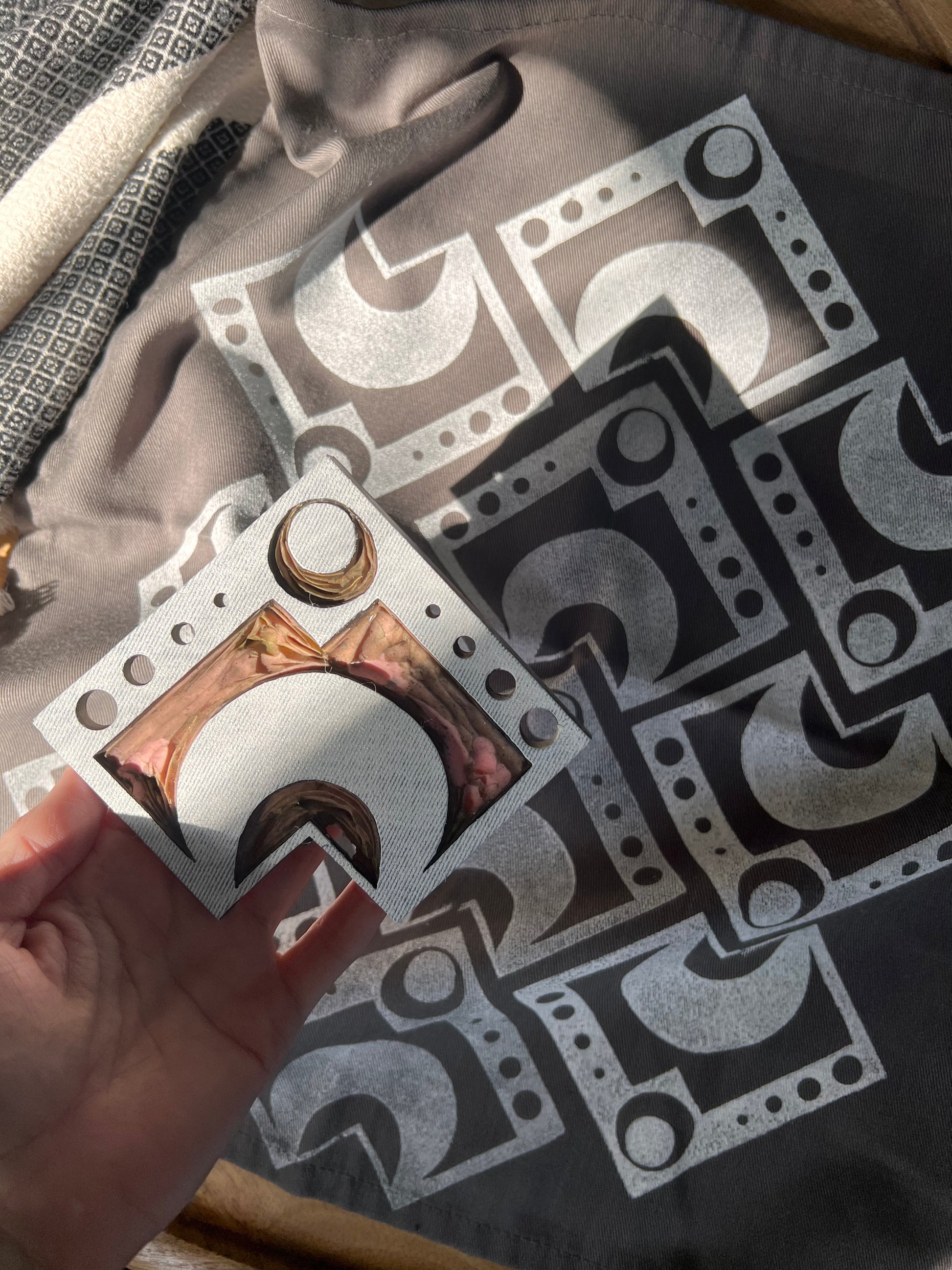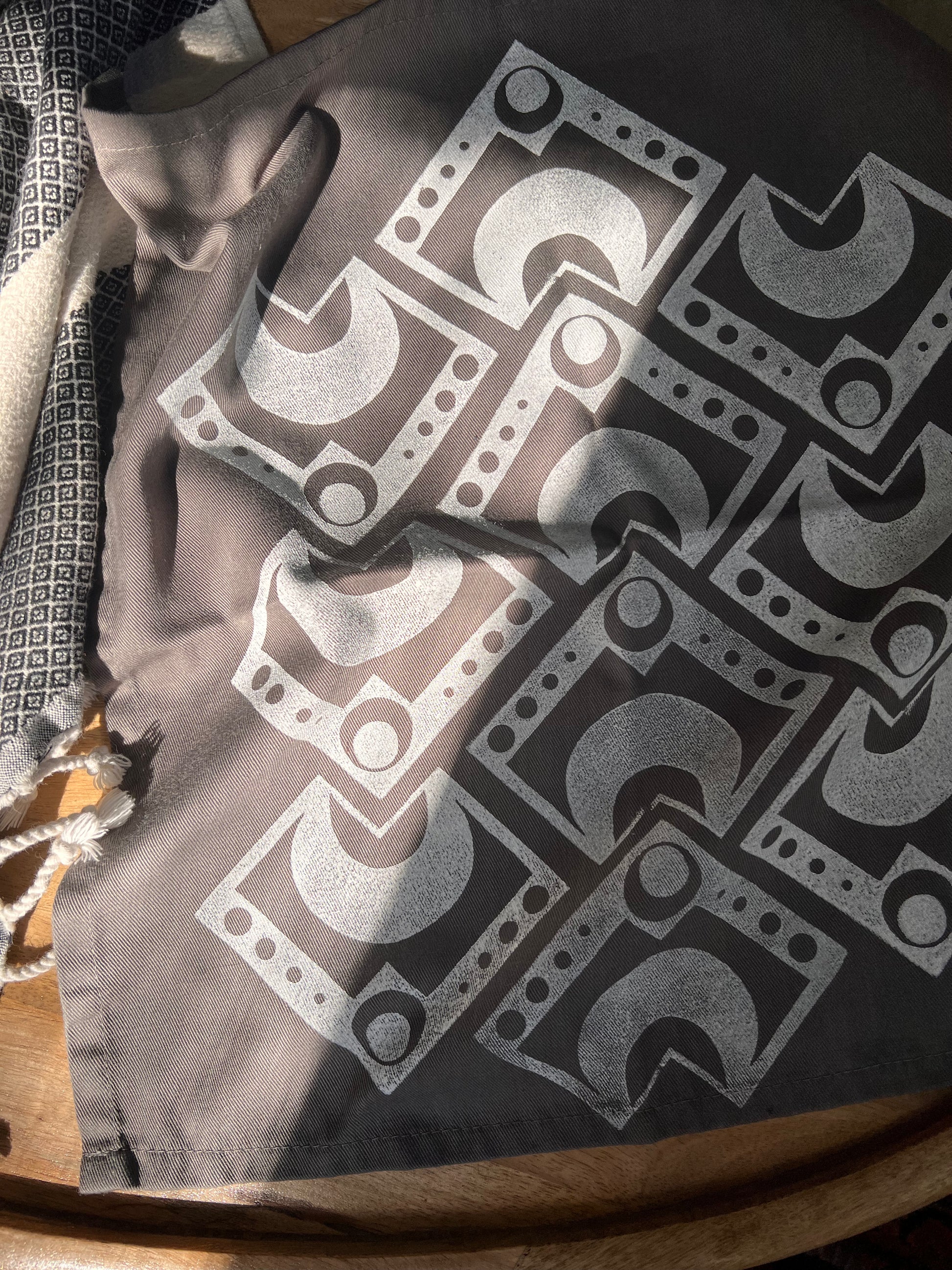Set of two grey cotton blend napkins, approximately 18 by 18 inches. A geometric pattern inspired by the phases of the moon, printed in white.