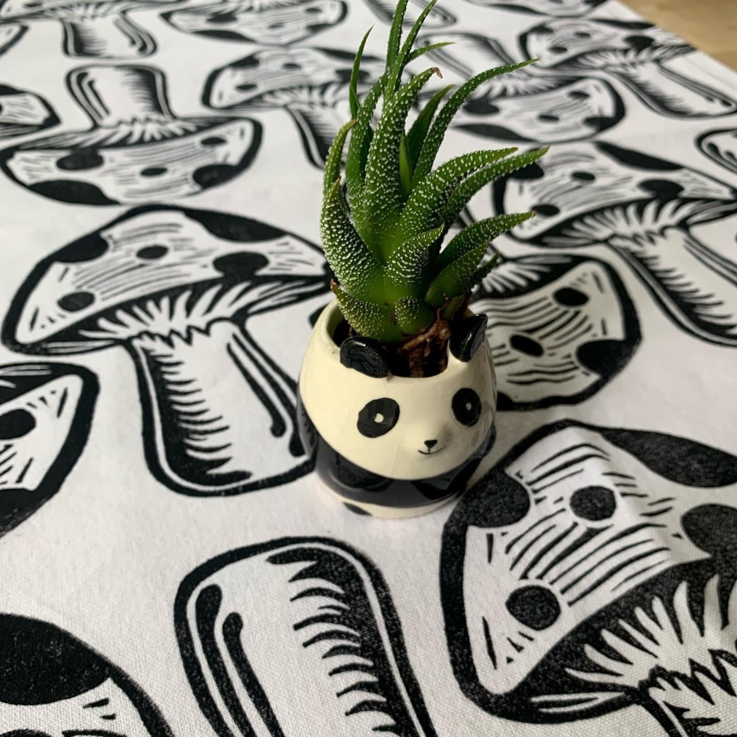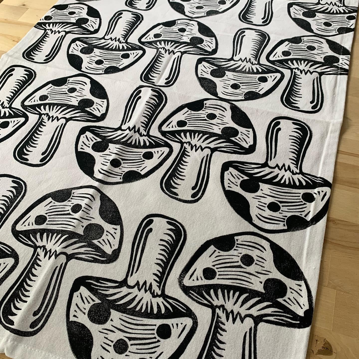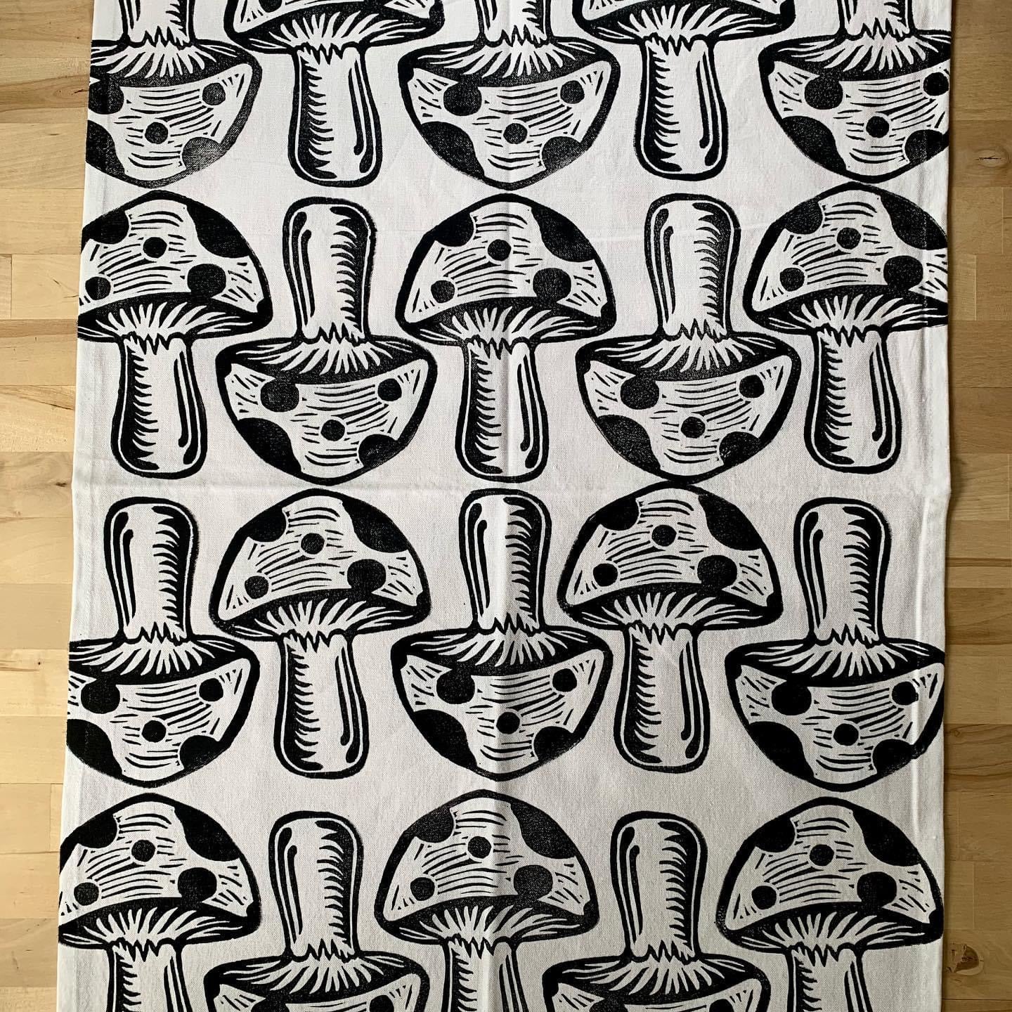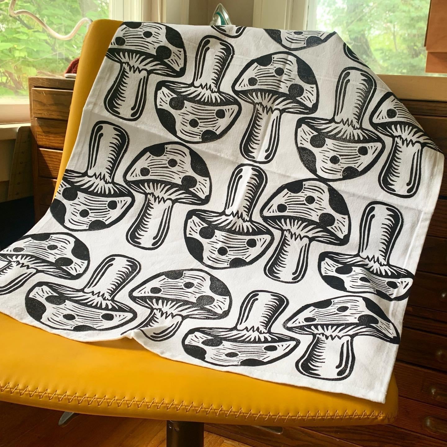 Featured in black ink on a heavy weight woven cotton, approximately 20x28” with a hanging loop. This is the perfect width to display across the oven.