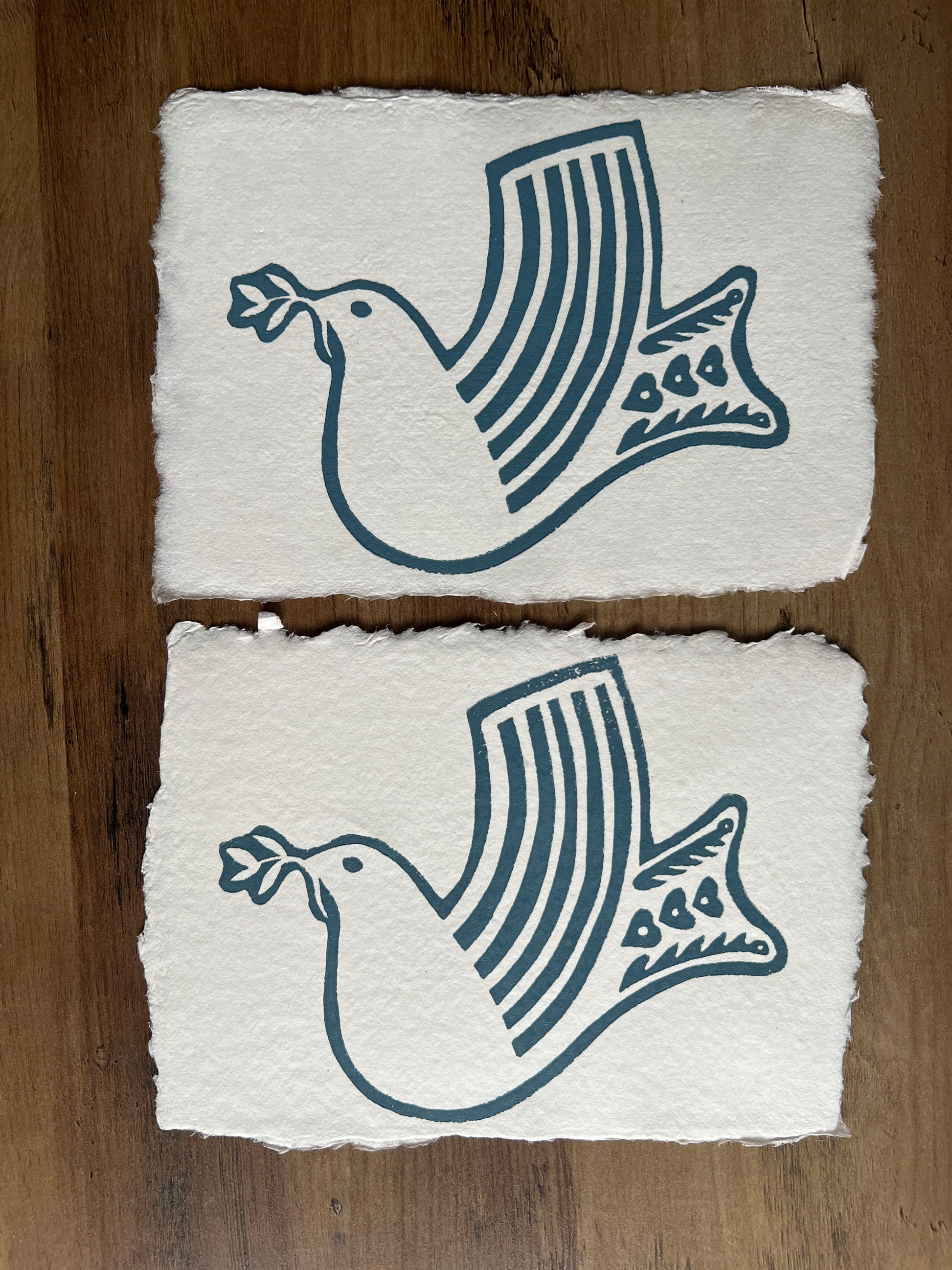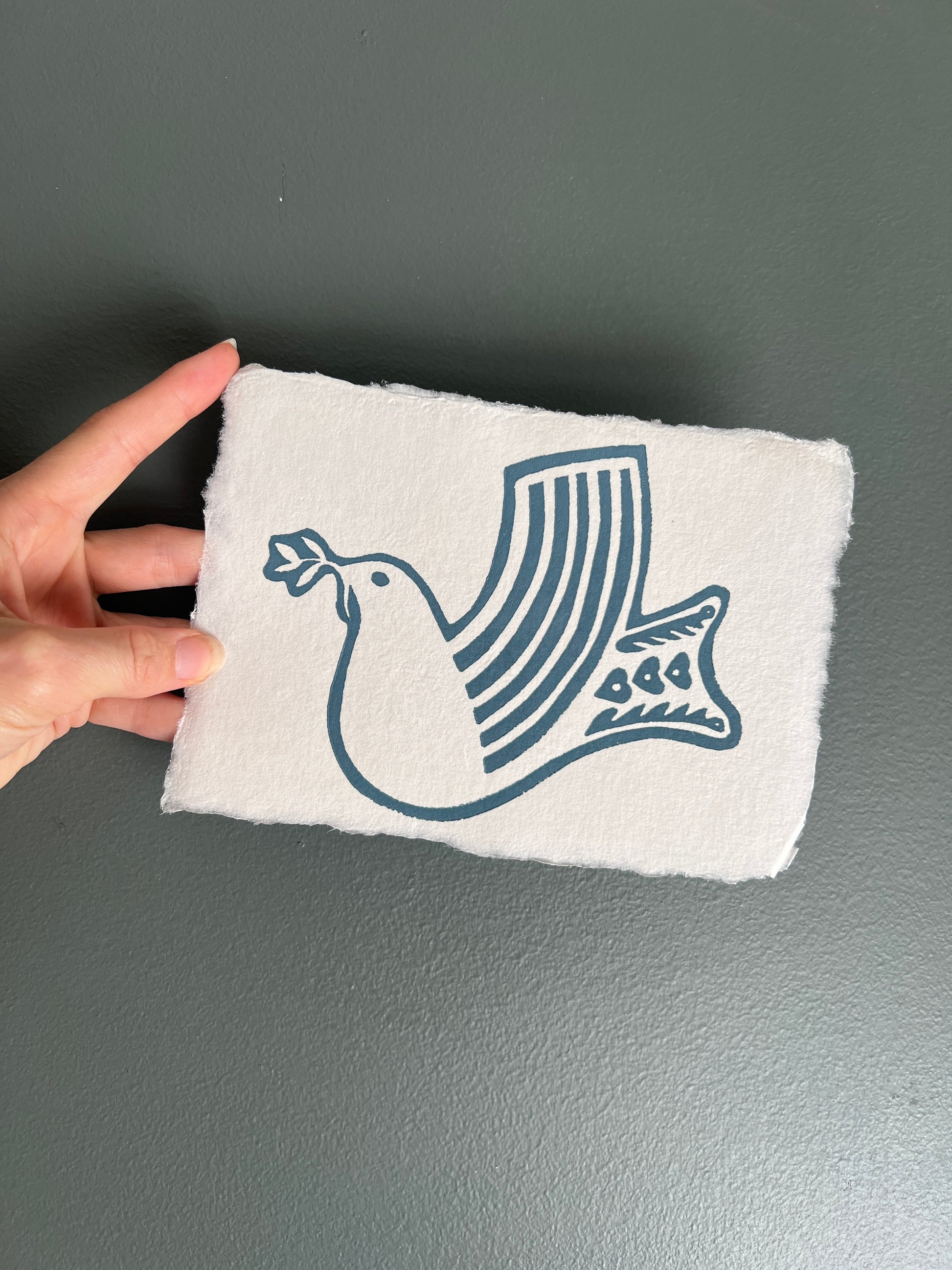 5x7” Handmade cotton paper in a beautiful terra cotta color with a deckled edge, printed with archival quality relief ink.