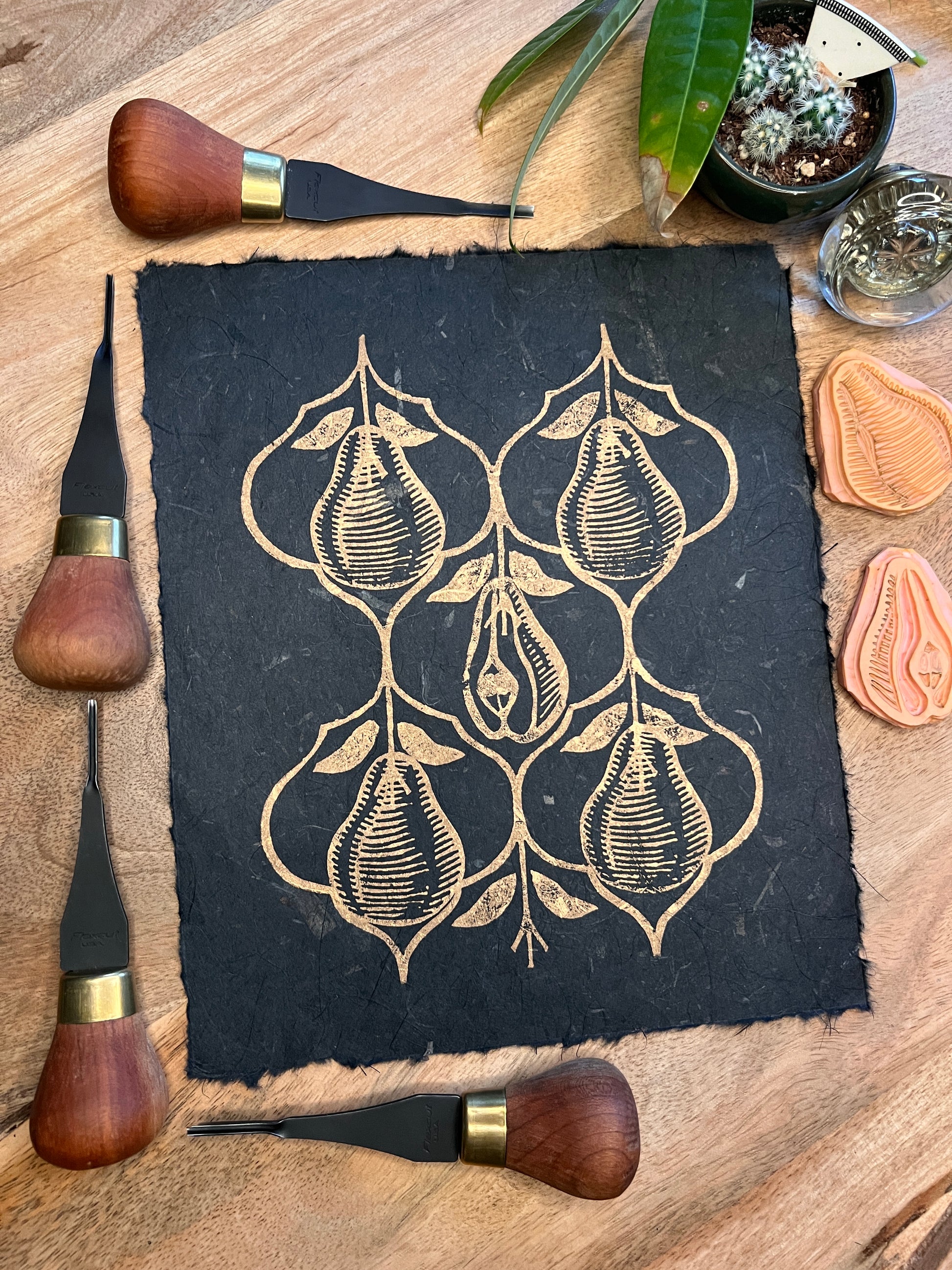 Three blocks, hand carved into linoleum and pressed in my home studio. This listing is for an original, handmade print.