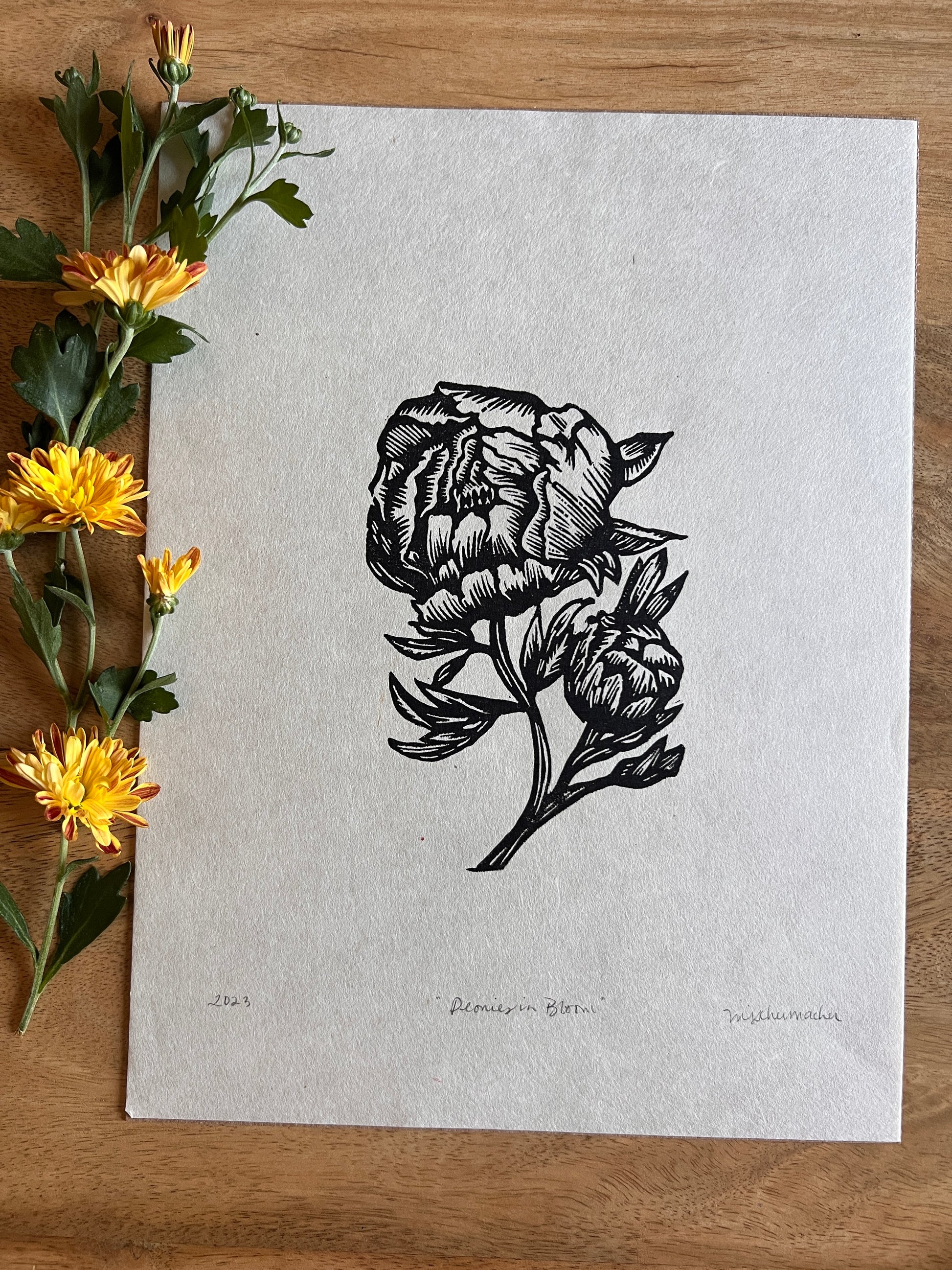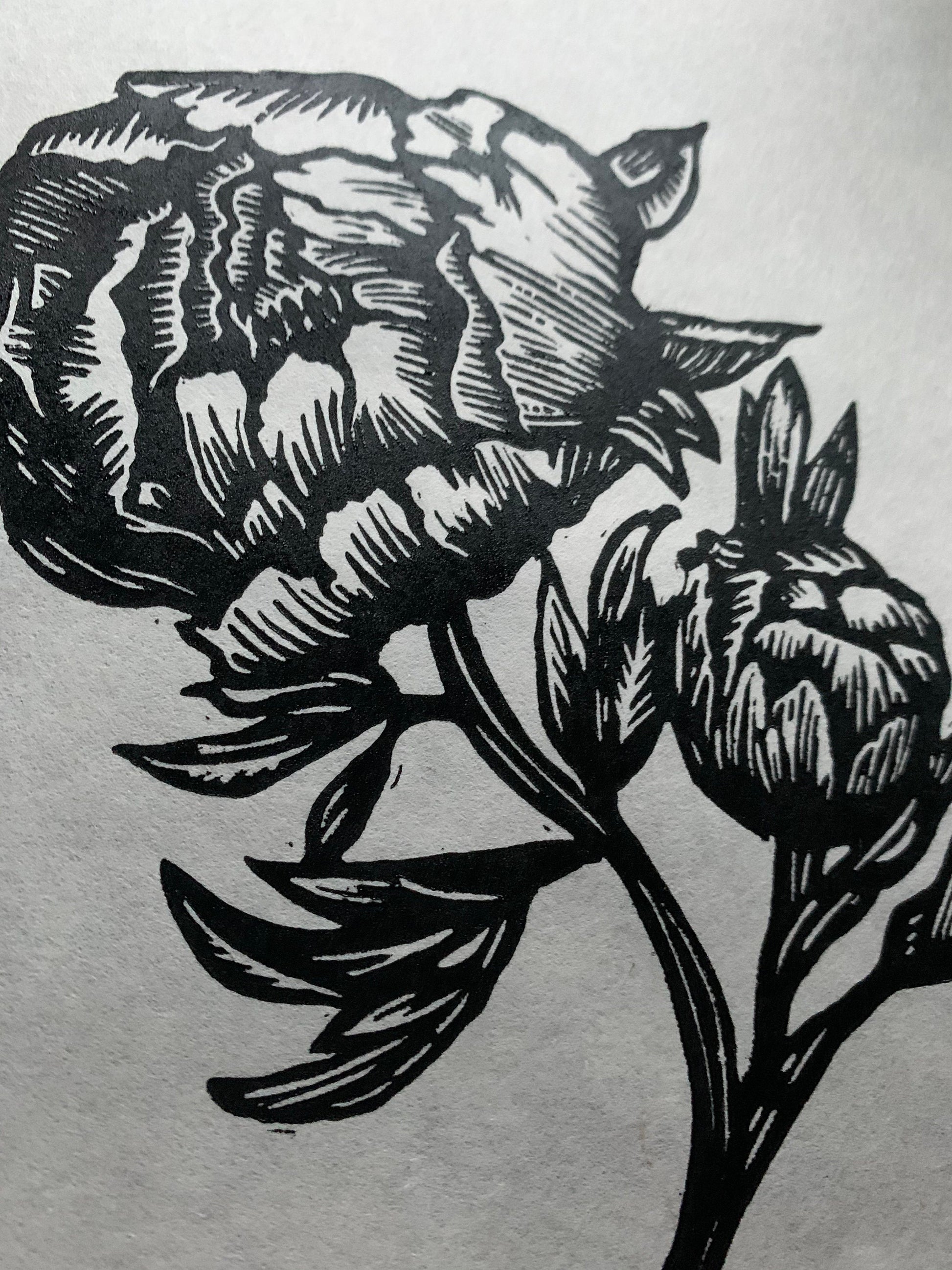 Original botanical illustration is hand carved into linoleum as a reverse image and hand pressed onto fine paper with professional relief ink. A delicate floral piece with intricate line work, created during that seemingly endless period in the Midwest between the end of winter and the beginning of spring. Shown with black ink or a luminous gold ink. Each of these variations bring the unique texture and charm of the materials to the print.