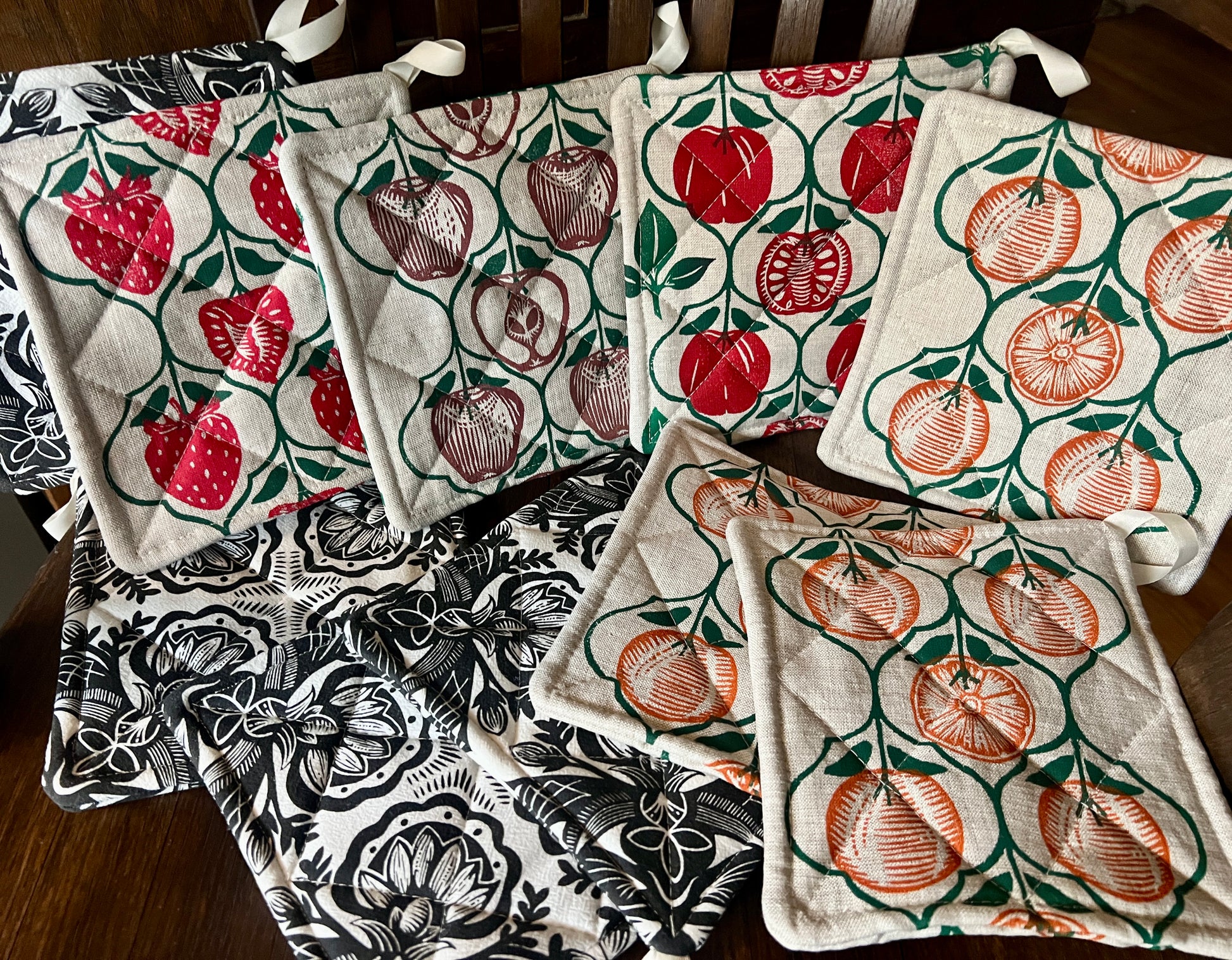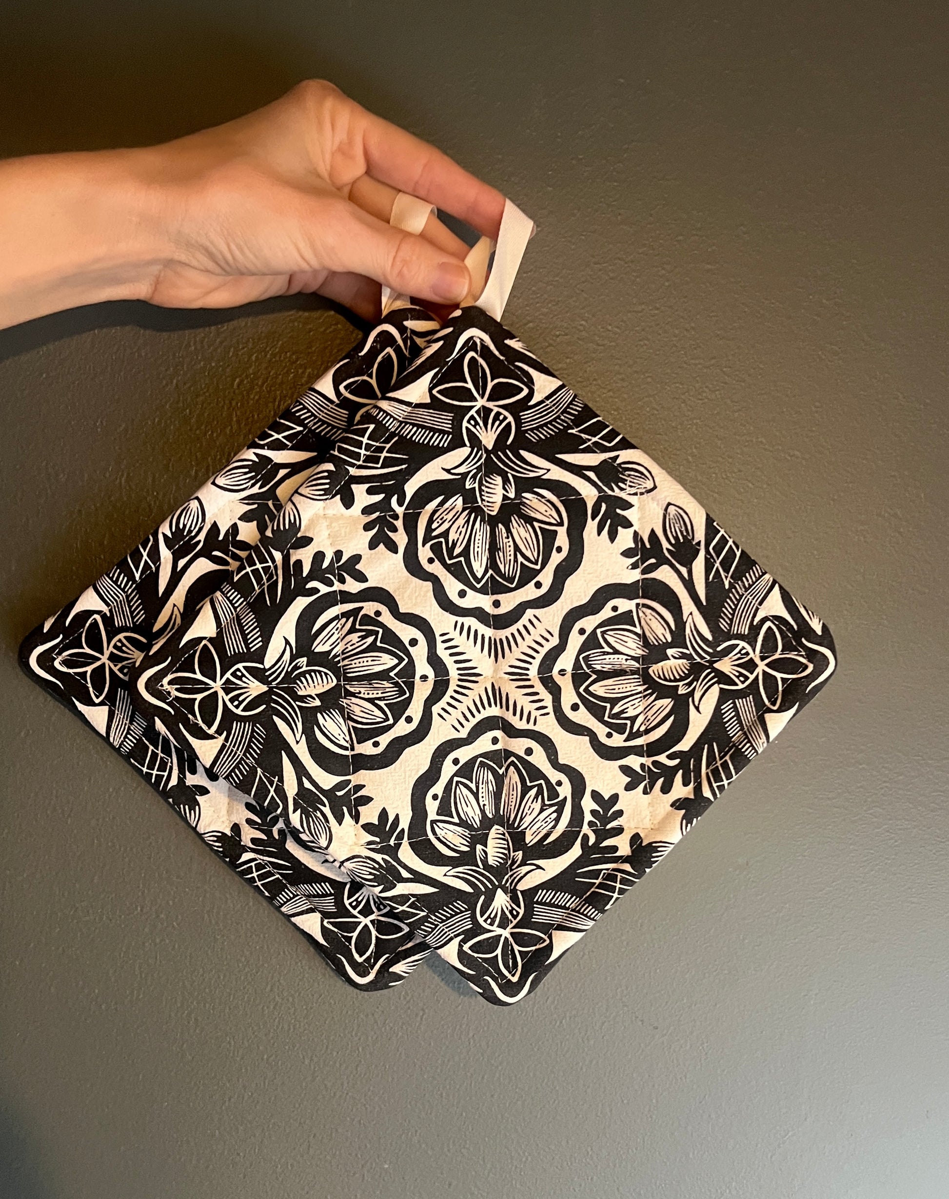 Pot Holder is approximately 7 inches square with a twill hanging loop. Hand Block Printed with original pattern designs on European Linen. The Rosemaling design is silkscreen printed on heavy weight cotton.
