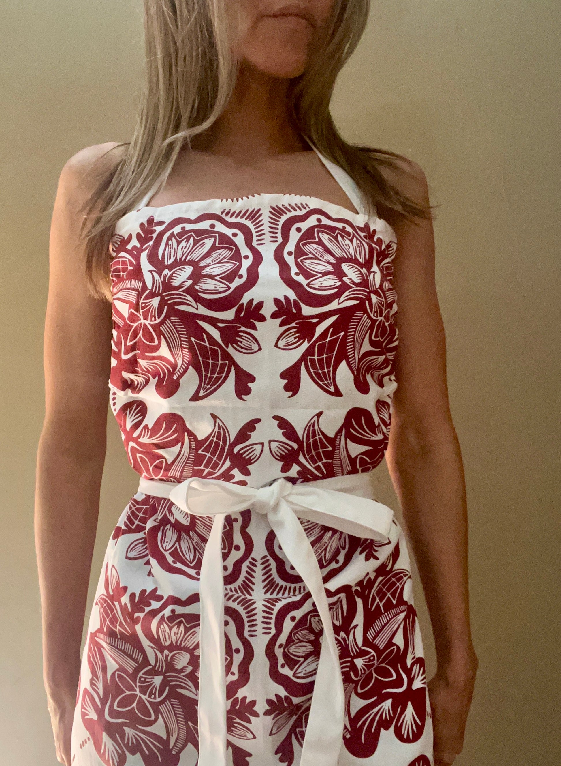 100% cotton apron, silkscreen printed in an original repeat pattern in black and red ink. This design is inspired by Norwegian ancestry.