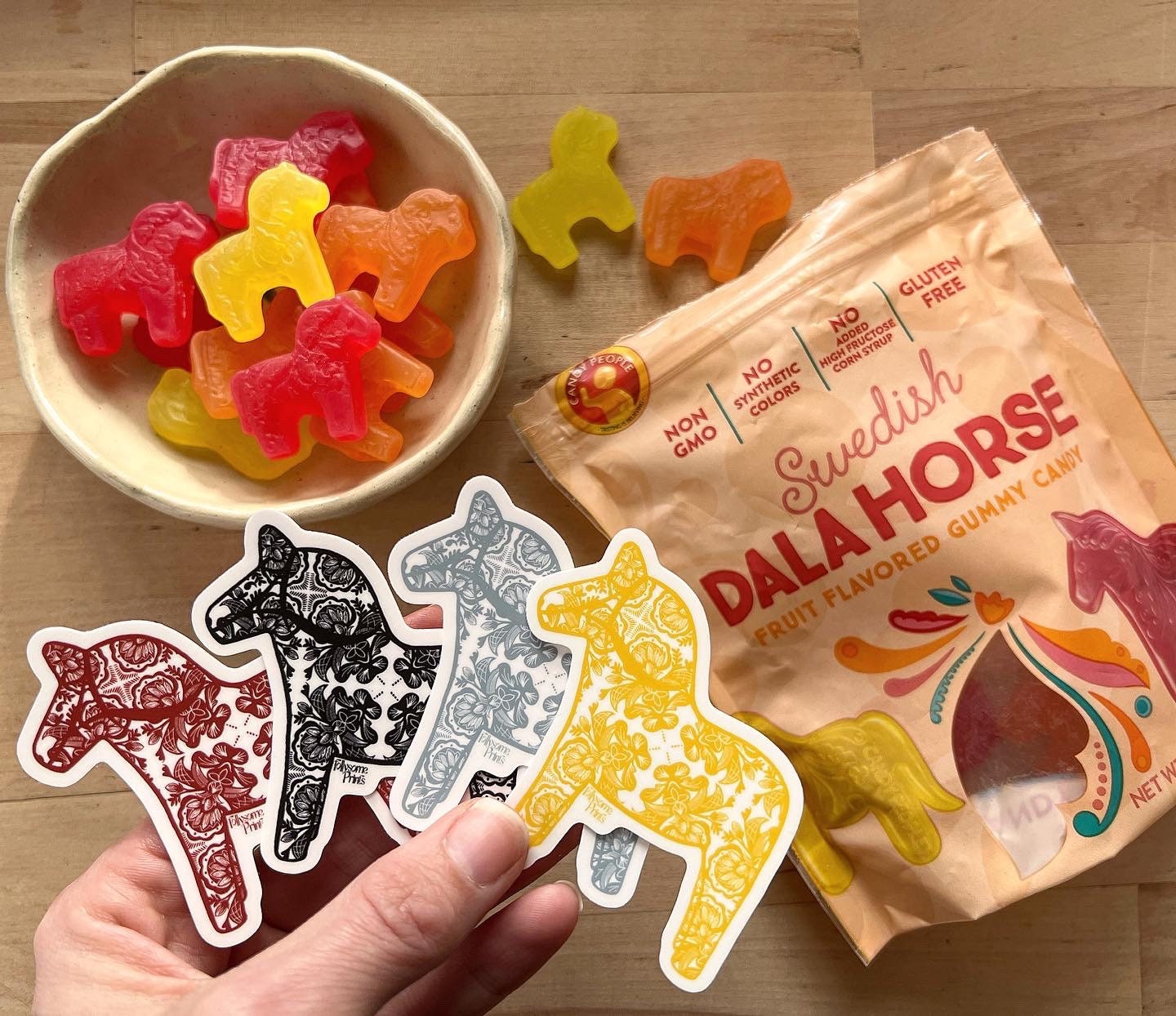 A celebration of Nordic folk art with a nod to the Swedish Dala Horse and Norwegian Rosemaling art. This original design comes printed in 4 traditional colors; Rust red, Norwegian blue, Mustard yellow and Black. Sets include one of each color in a holographic sleeve. Ships as a standard letter, US First Class Mail or ships free with any other purchase.