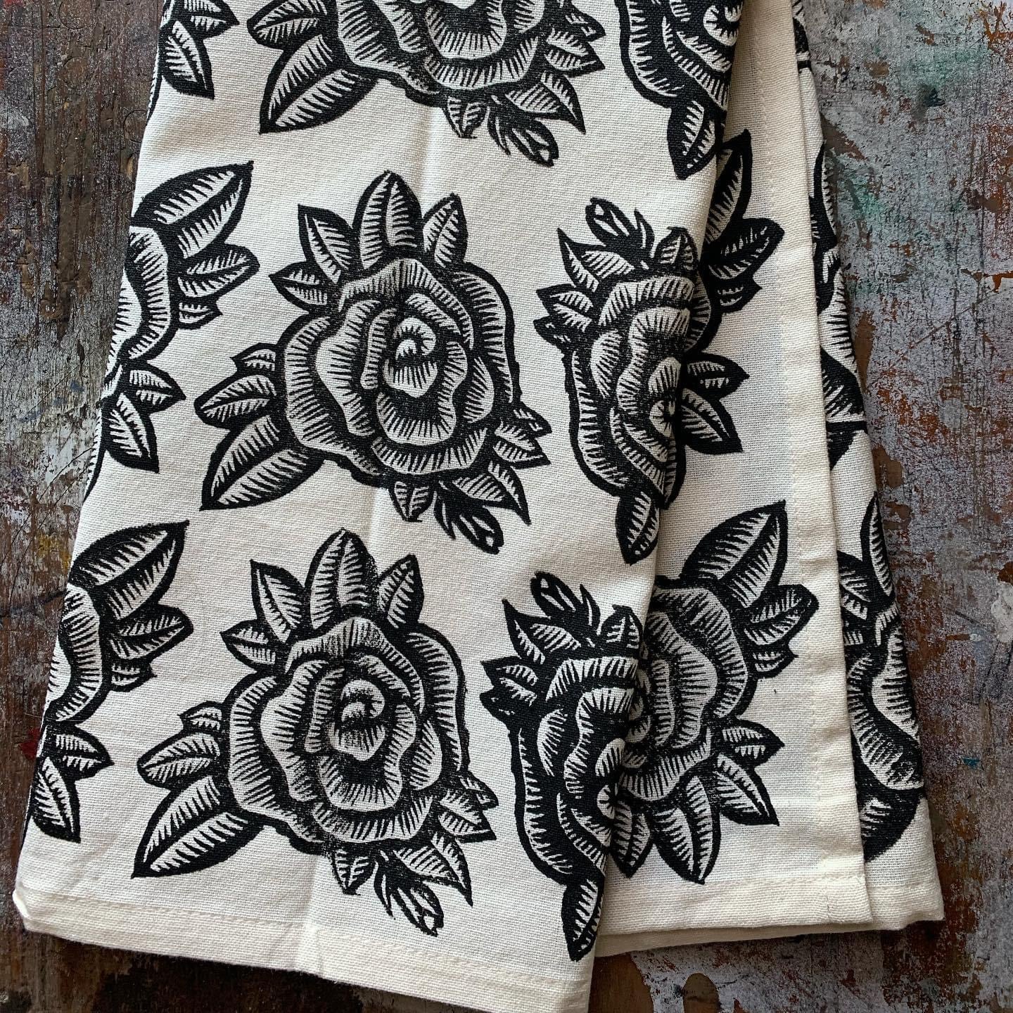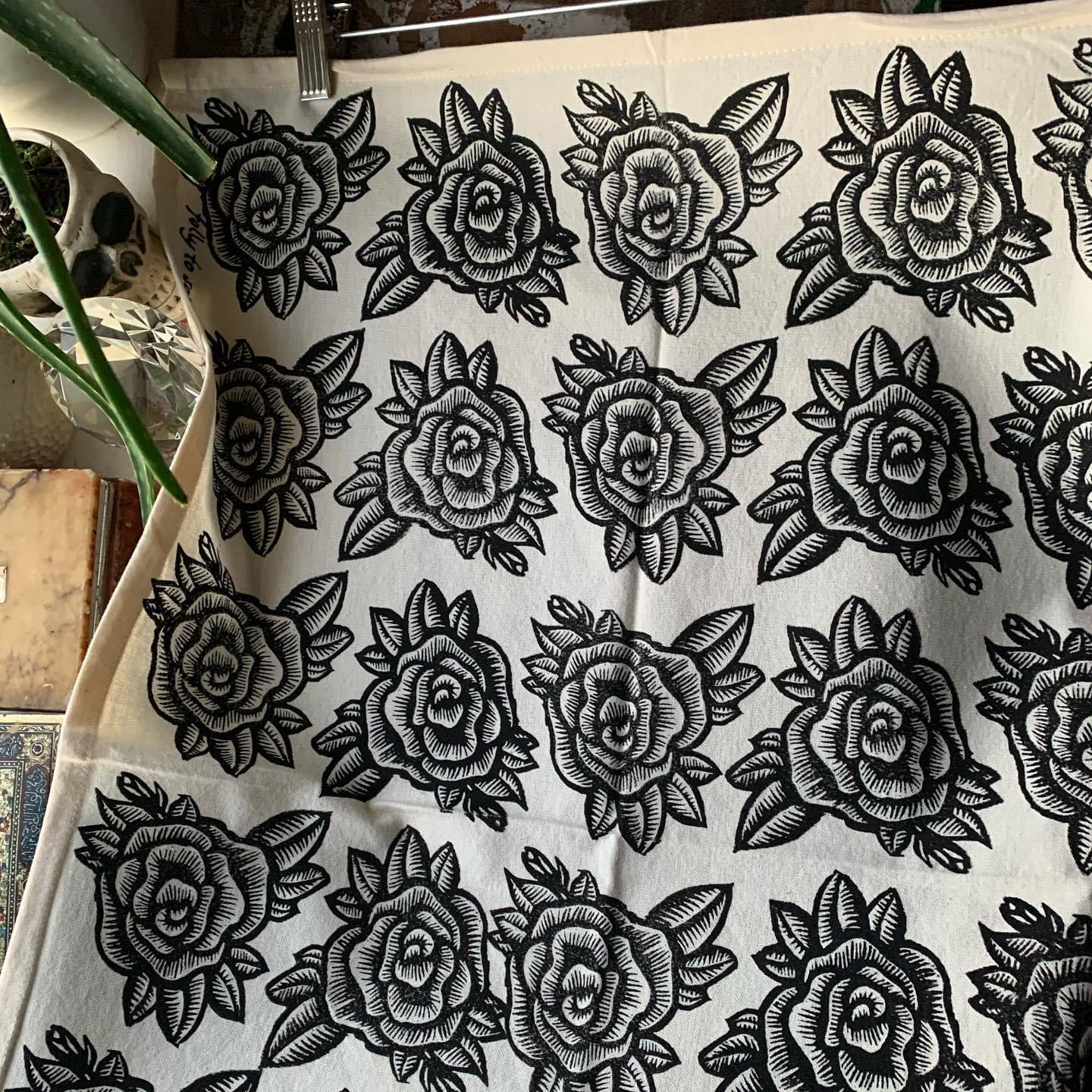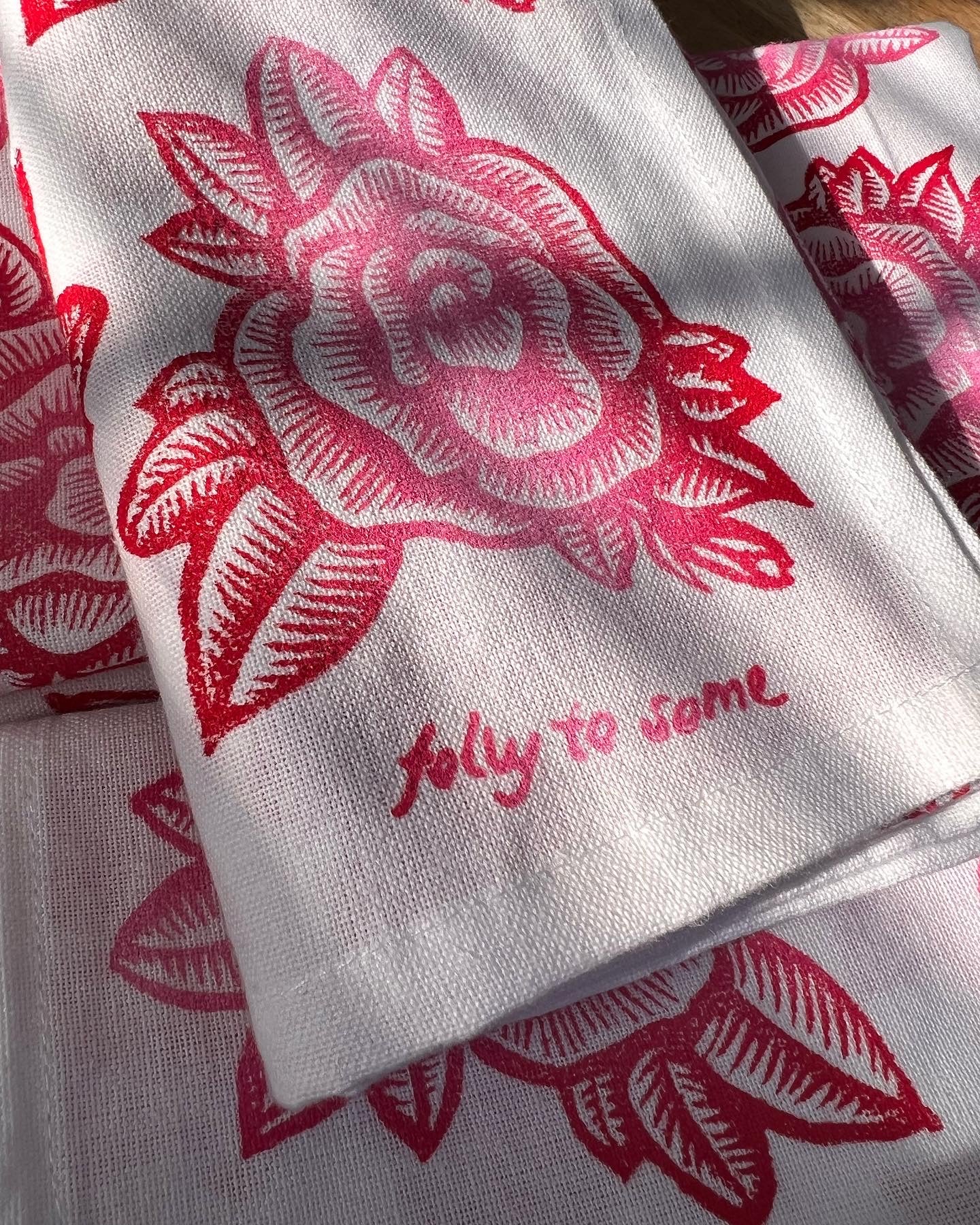 Featured in a hot pink gradient or black ink on a heavy weight woven cotton, approximately 20x28” with a hanging loop. This is the perfect width to display across the oven.