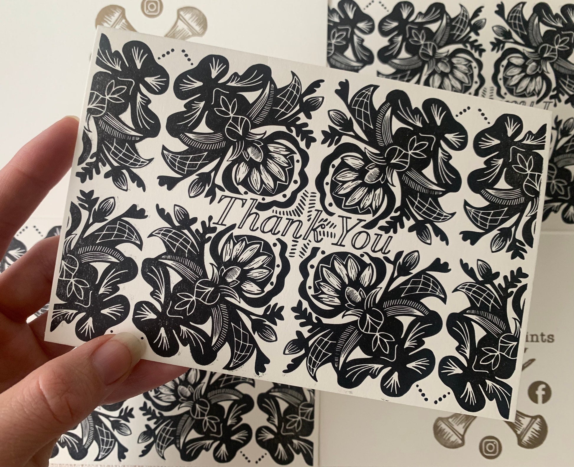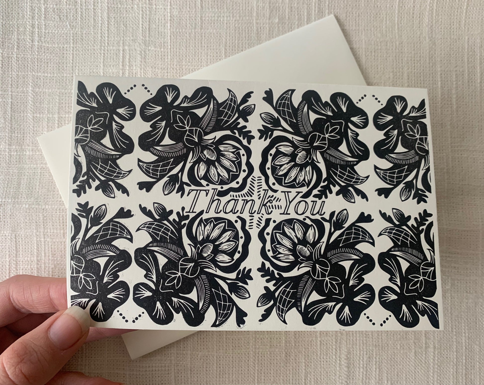 4x6” Greeting Cards in black ink on ivory paper with ivory envelope, featuring my original folk art design inspired by my Norwegian heritage. These show some slight variation in ink coverage and light embossing because each is individually run through an antique printing press. Order an individual greeting card or set of blank cards.