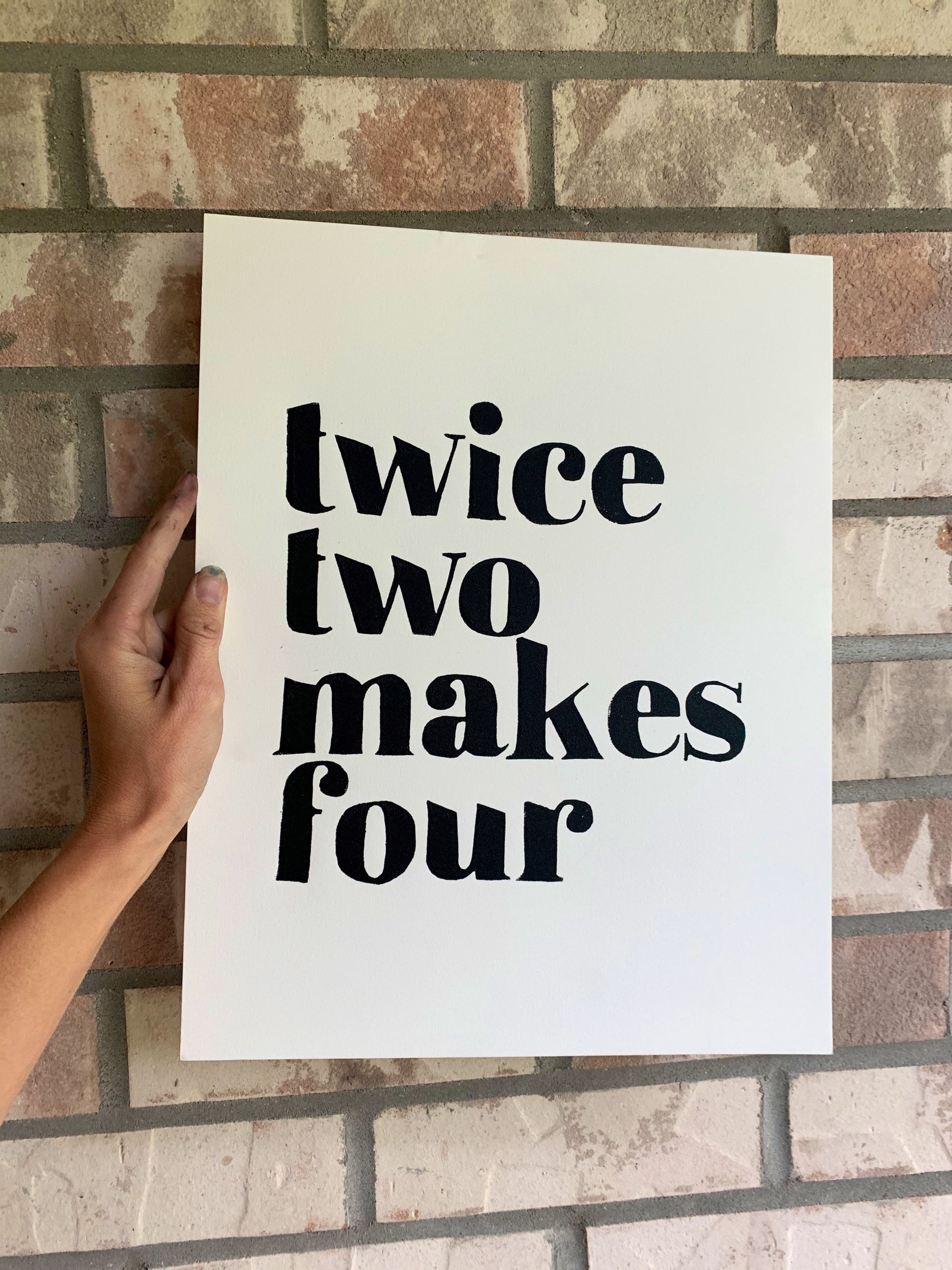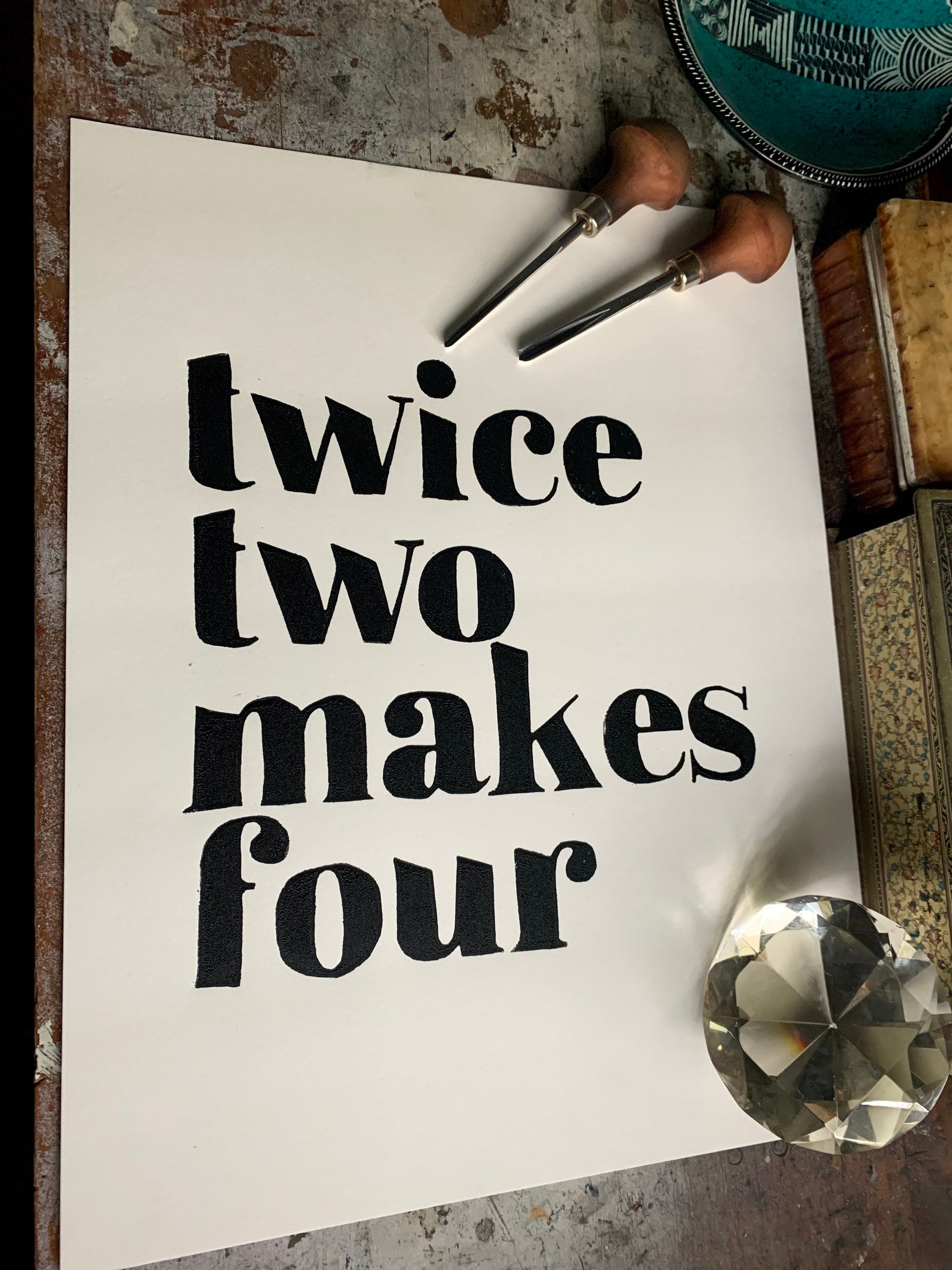 “Twice Two Makes Four” is the simple statement that there is objective truth accessible to us through scientific discovery, but it has broader implications to human consciousness and epistemology, compatibility theories of determinism and of course freedom from authoritarian oppression. “Freedom is the freedom to say two plus two makes four... If that is granted, all else follows.” George Orwell, 1984. There is a rich literary and political history of the formula 2+2=4 and we find ourselves in a time of postmodernists seeking to deconstruct the most basic truths with the eternally recurring propaganda that 2+2 can sometimes equal 5. Hand carved and hand printed with archival quality materials. Signed and dated by the artist, limited edition artwork.